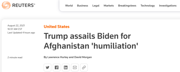 不过路透社报道同时提到,特朗普一再将塔利班迅速占领阿富汗归咎于拜登政府,尽管当初撤军决定是特朗普政府与塔利班谈判后达成的。