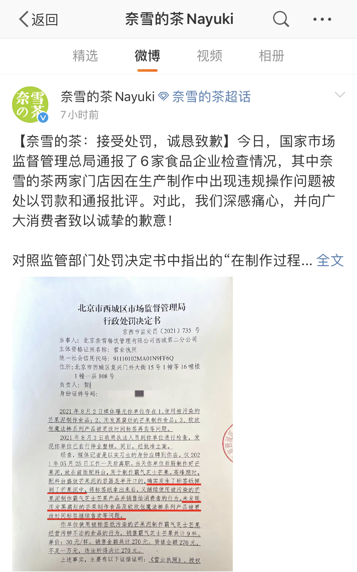 8月23日,国家市场监督管理总局通报了6家食品企业检查情况,其中奈雪的茶两家门店因在生产制作中出现违规操作问题被处以罚款和通报批评。8月24日凌晨,奈雪的茶在官方微博回应称,接受处罚,诚恳道歉,并表示立即开展自查自纠,并要求所有门店员工严格按照生产流程进行操作,杜绝任何不规范行为。