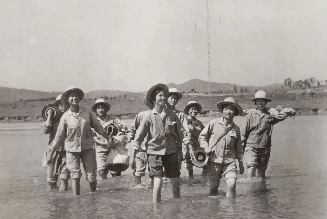 ▲ 20世纪70年代,“三八”带电作业班在清远县参加带电作业时,蹚水经过一处河流。