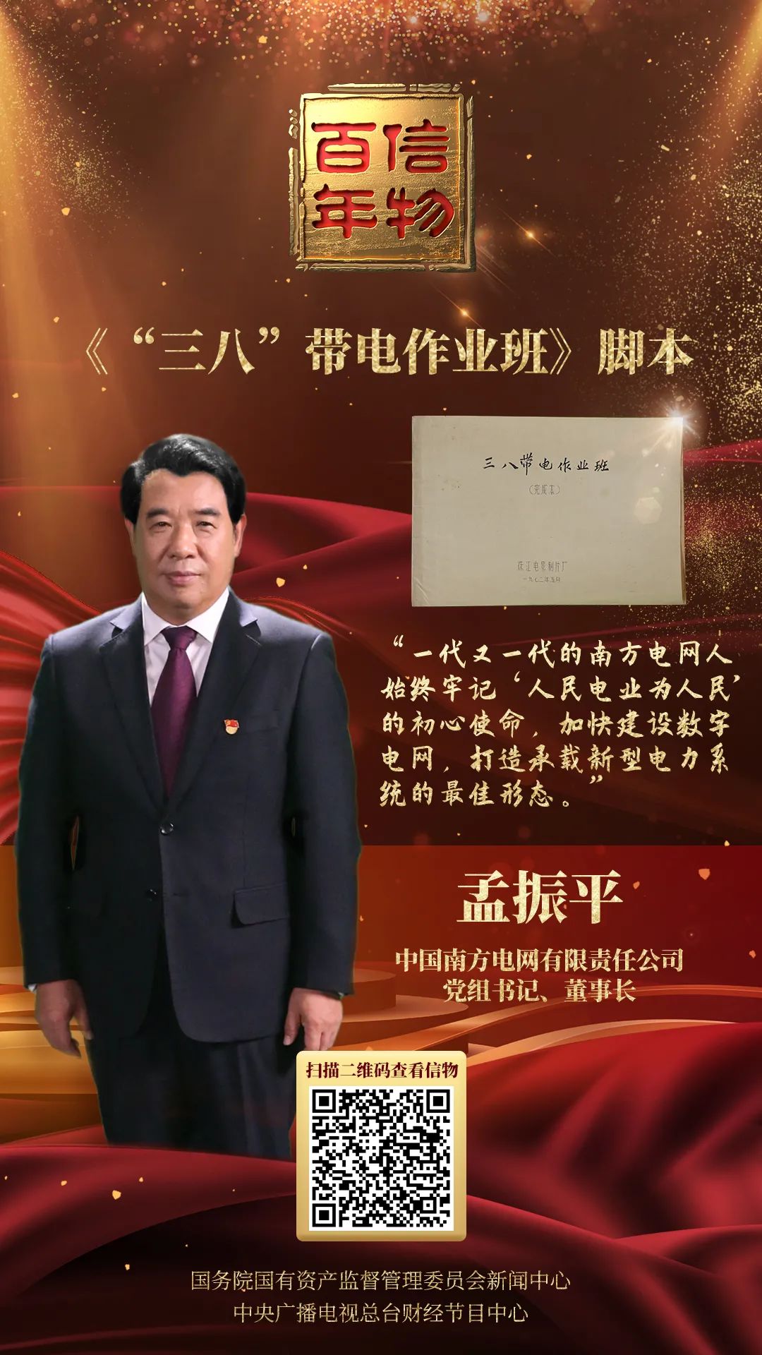 今天,为您分享《信物百年》第59集《<“三八”带电作业班>脚本》,听信物讲述人,中国南方电网有限责任公司党组书记、董事长孟振平讲述中国首个“三八”带电作业班背后的动人故事和精神传承。