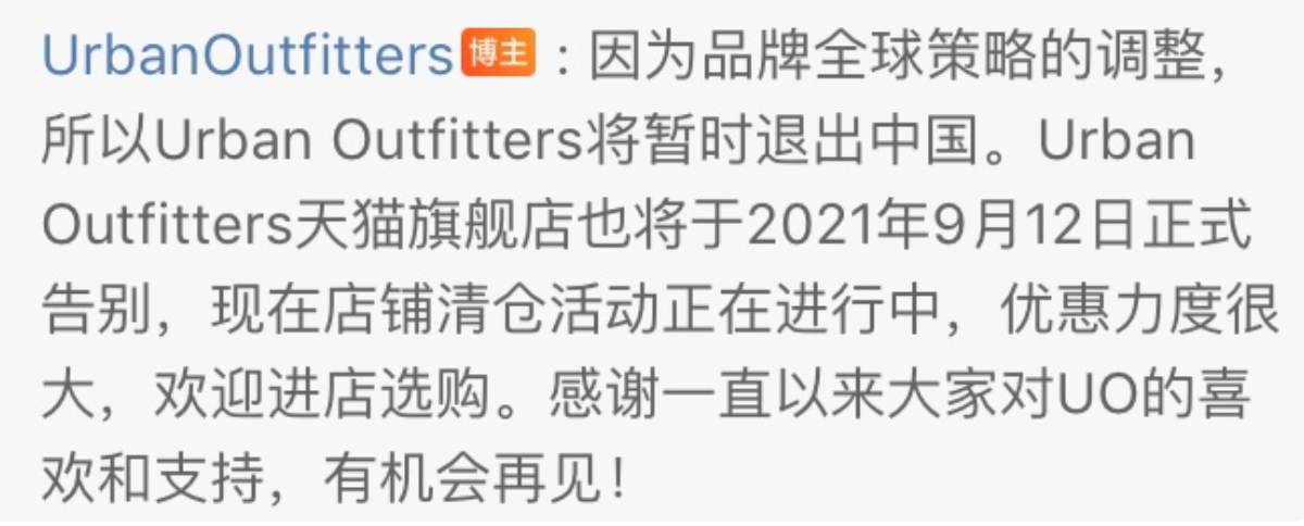 对于退出中国市场的原因,Urban Outfitters品牌方在微博上解释为:“因为品牌全球策略的调整,所以Urban Outfitters将暂时退出中国。”