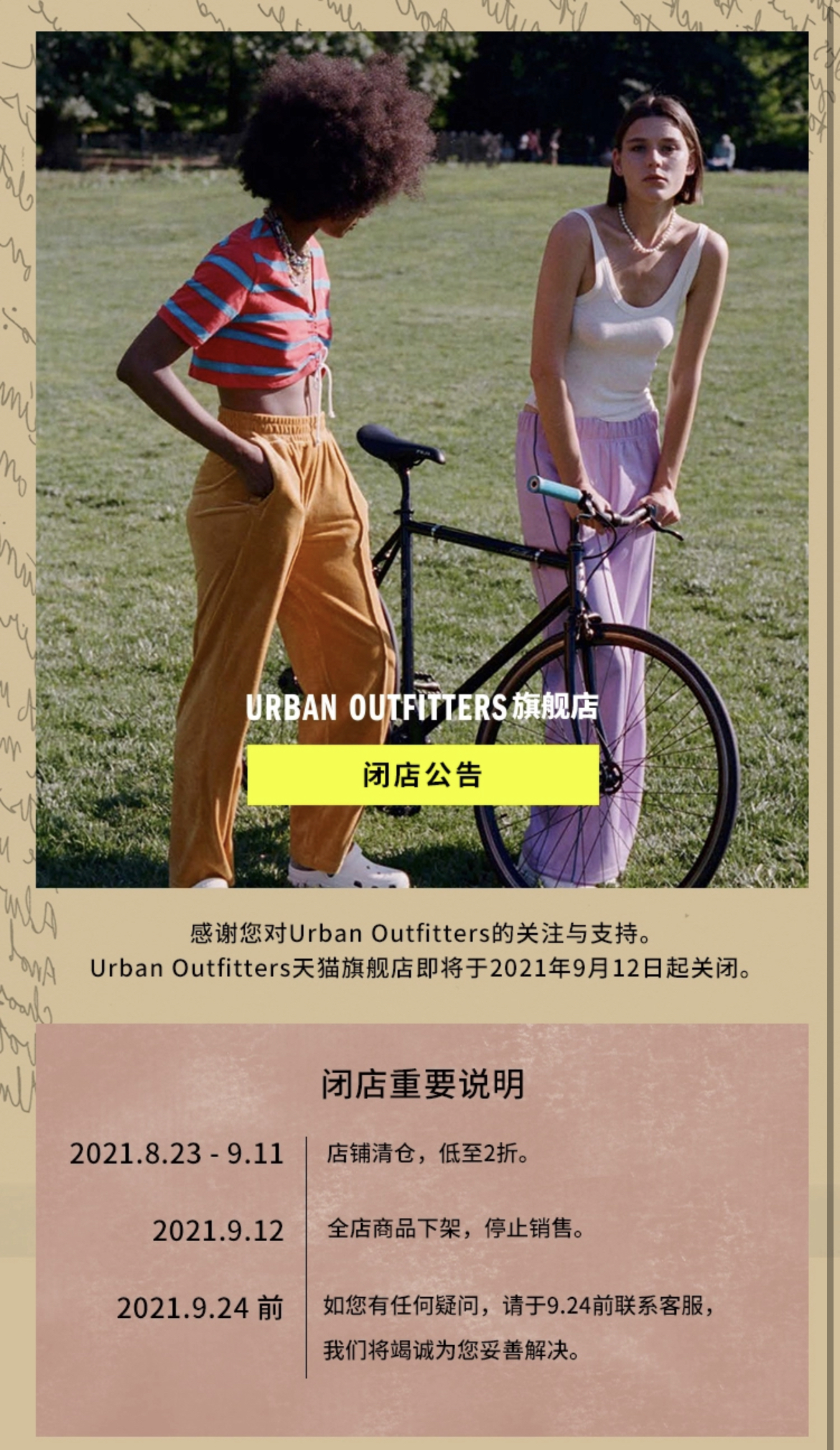 又一国际快时尚品牌将退出中国市场。8月25日,美国连锁服装品牌Urban Outfitters天猫旗舰店发布闭店声明,店内商品将在8月23日至9月1日进行清仓,所有商品会在9月12日下架,停止销售,客服则会继续运营至9月24日。