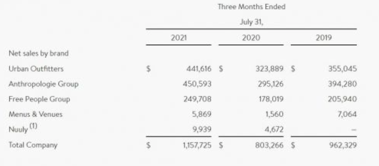 虽然折戟中国市场,但就近期全球业绩看,Urban Outfitters表现还算不错。近日,Urban Outfitters发布2021财年第二季度(截至7月31日)业绩报告,披露销售额同比增长44.08%至11.58亿美元,净利润为1.27亿美元。其中,零售板块销售额增长43.86%;批发板块收入上升42.90%。