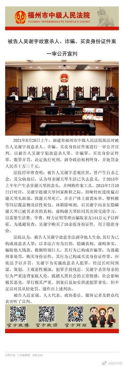备受关注的北大学子吴谢宇弑母案有了一审结果。8月26日上午,福建省福州市中级人民法院公开宣判,以被告人吴谢宇犯故意杀人罪、诈骗罪、买卖身份证件罪,数罪并罚,决定执行死刑,剥夺政治权利终身,并处罚金人民币十万三千元。