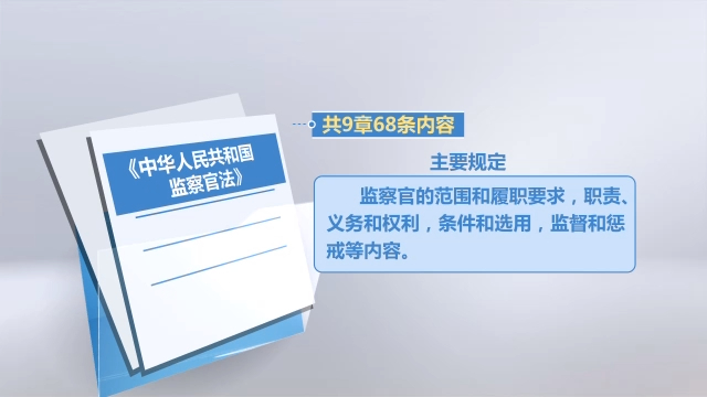 监察官法共9章68条内容,主要规定了监察官的范围和履职要求,职责、义务和权利,条件和选用,监督和惩戒等内容。