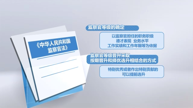 同时,监察官法还立足监察工作和监察人员管理特点,建立了监察官的等级制度架构。将监察官从总监察官到六级监察官,分为十三级。明确监察官等级的确定,以监察官担任的职务职级、德才表现、业务水平、工作实绩和工作年限等为依据。监察官等级晋升采取按期晋升和择优选升相结合的方式,特别优秀或者作出特别贡献的,可以提前选升。