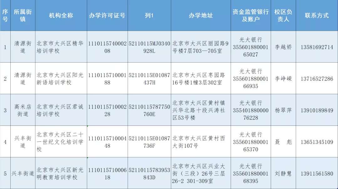 8月28日,大兴区教委公布了第一批学科类培训机构白名单、黑名单。白名单包括大兴区精华培训学校、大兴区阳光新语培训学校等5家;新诺阳光国际文化传播有限公司大兴第一分公司上了黑名单。