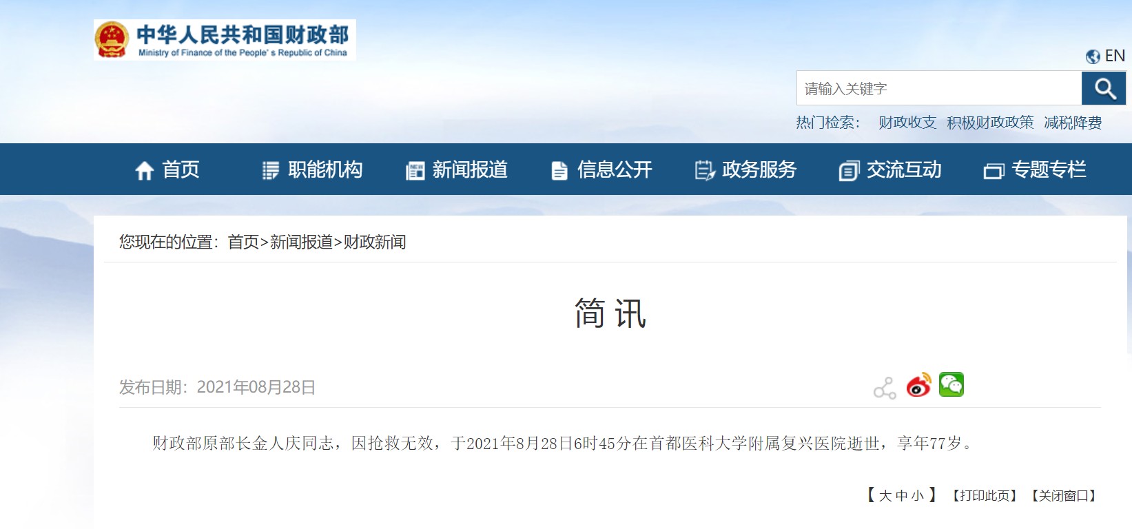 财政部网站消息,财政部原部长金人庆同志,因抢救无效,于2021年8月28日6时45分在首都医科大学附属复兴医院逝世,享年77岁。