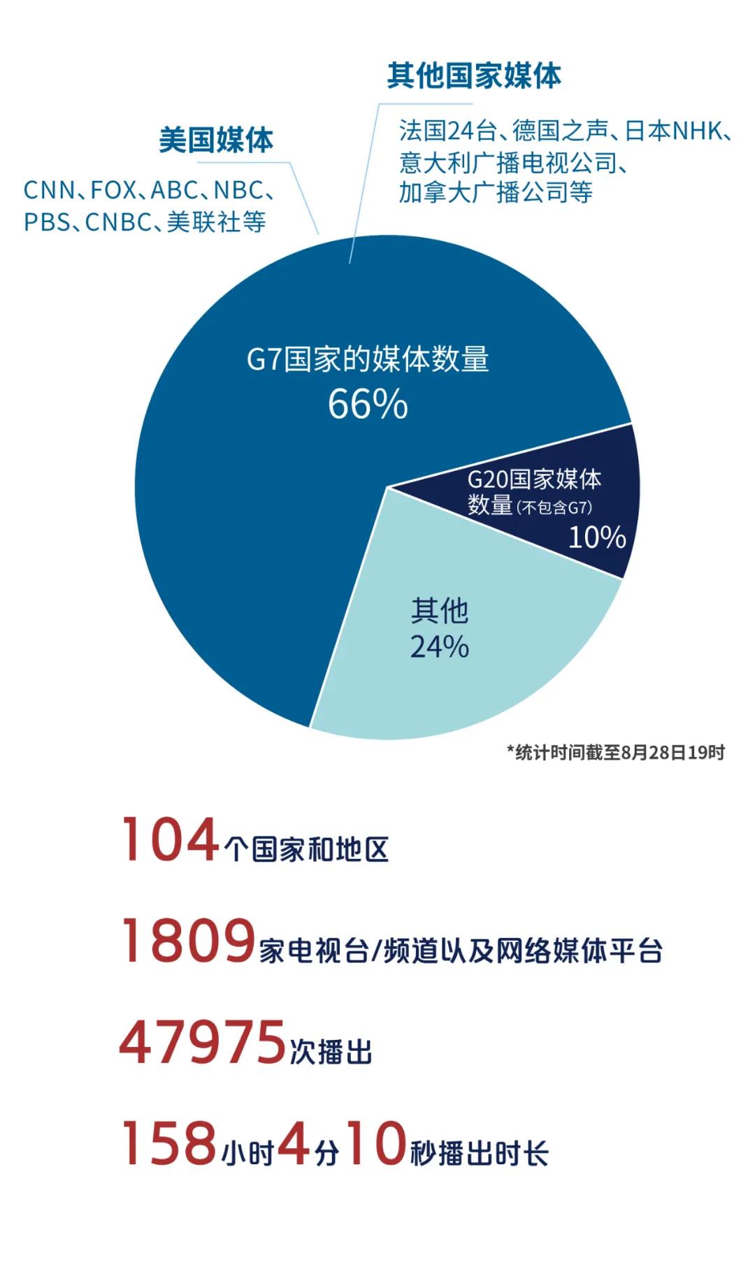 持续传播中国的态度和声音是总台义不容辞的责任和义务。截至8月24日,总台编发中国外交部阿富汗事务特使岳晓勇以及我国外交部发言人华春莹相关表态新闻素材35条,总时长1小时10分37秒,共被82个国家和地区的367家电视及新媒体平台引用播出2681次,播出总时长10小时59分48秒。其中,G7国家媒体数量占比36%,G20国家媒体数量占比51%。