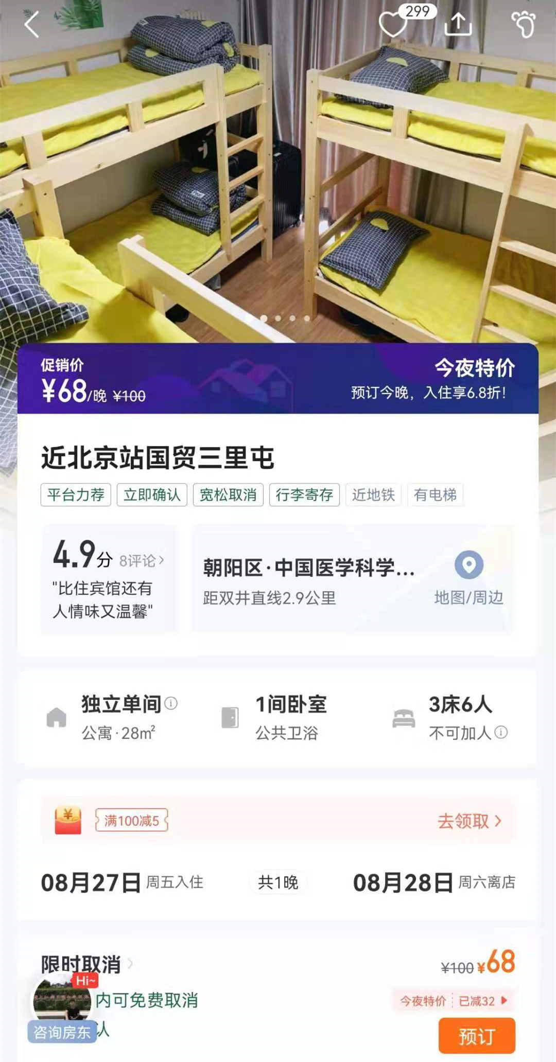 在一家民宿APP中,页面显示还可以预定上下铺的房间。