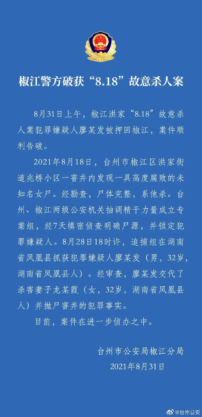 浙江台州椒江警方破获洪家“8.18”故意杀人案