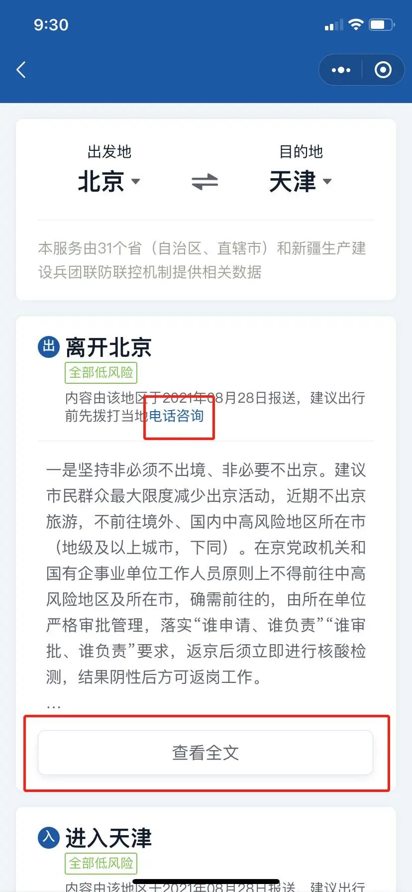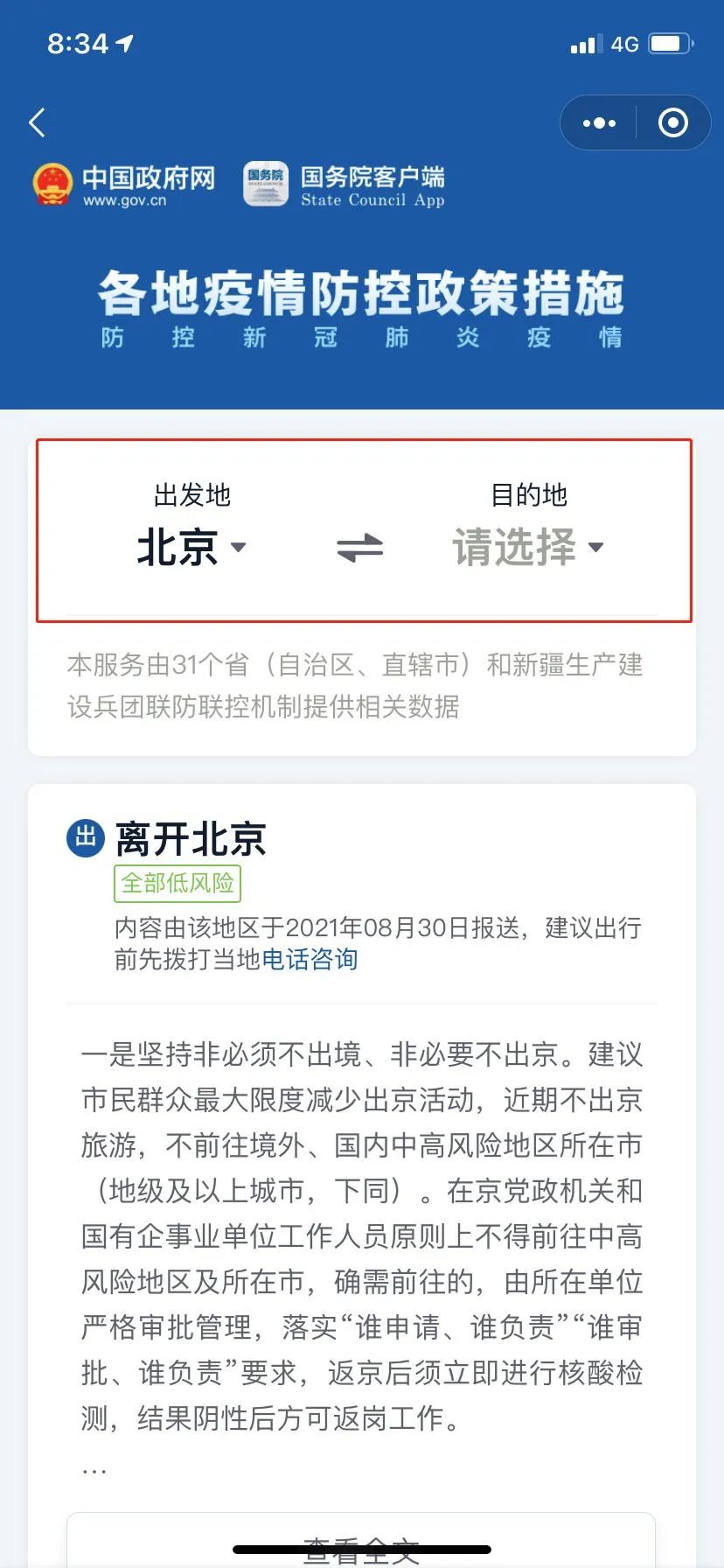 输入出发地和目的地,即可实时查询两地的出入政策。