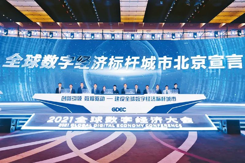 近年来,北京立足自身资源禀赋,坚持国际一流、首善标准,积极打造中国数字经济发展“北京样板”。2021年8月2日,以“创新引领 数据驱动——建设全球数字经济标杆城市”为主题的首届全球数字经济大会在北京国家会议中心开幕。图为《全球数字经济标杆城市北京宣言》发布现场。 侯少卿/摄