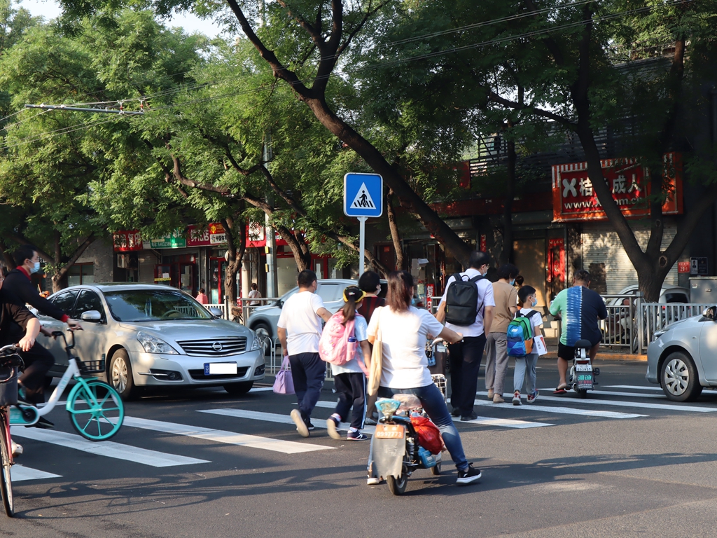 9月1日早7时开始,校园周边的车辆明显增多,记者在交道口南大街、东四北大街几处校园周边的路口看到,尽管一些路口没有设置红绿灯,多数机动车在斑马线前也能做到文明礼让。