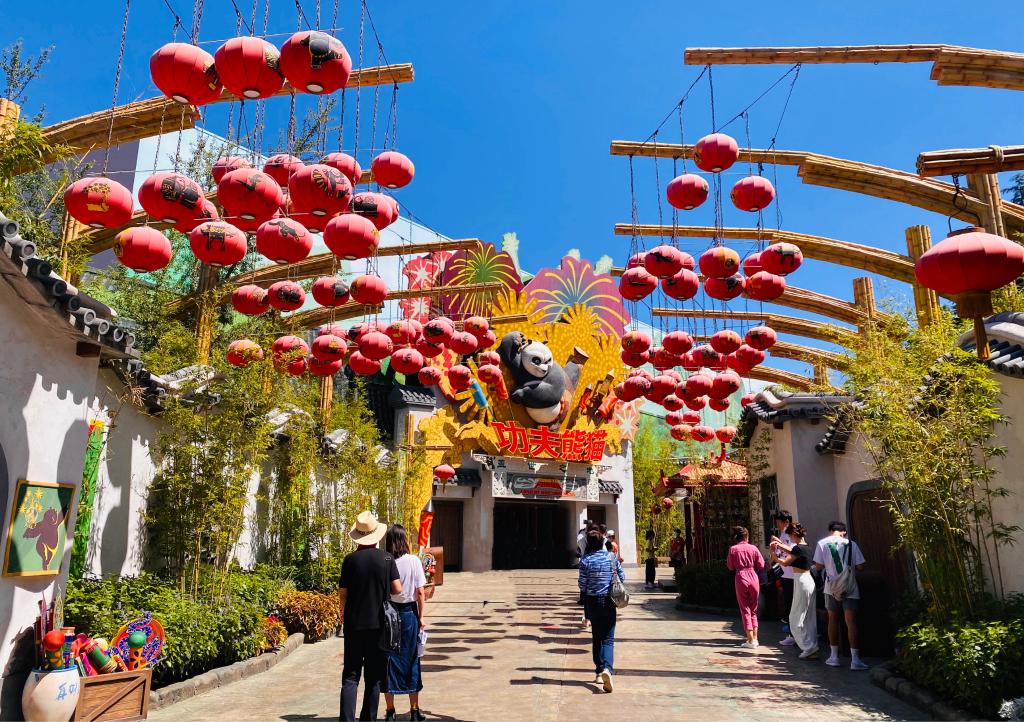 中国味儿最浓的当属功夫熊猫盖世之地主题景区。步入这个全室内景区,仿佛闯入一个梦幻的东方仙境。随意驻足,就被原汁原味的中国元素所环绕:门口的半空悬着由竹子挑起来的大红灯笼;和平山谷里张灯结彩,俨然一个欢乐的夜市。