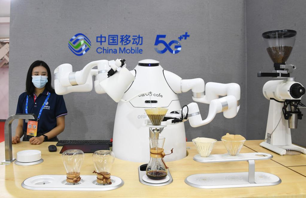 ↑8月31日在2021世界5G大会展览现场拍摄的咖啡机器人。新华社记者 任超 摄