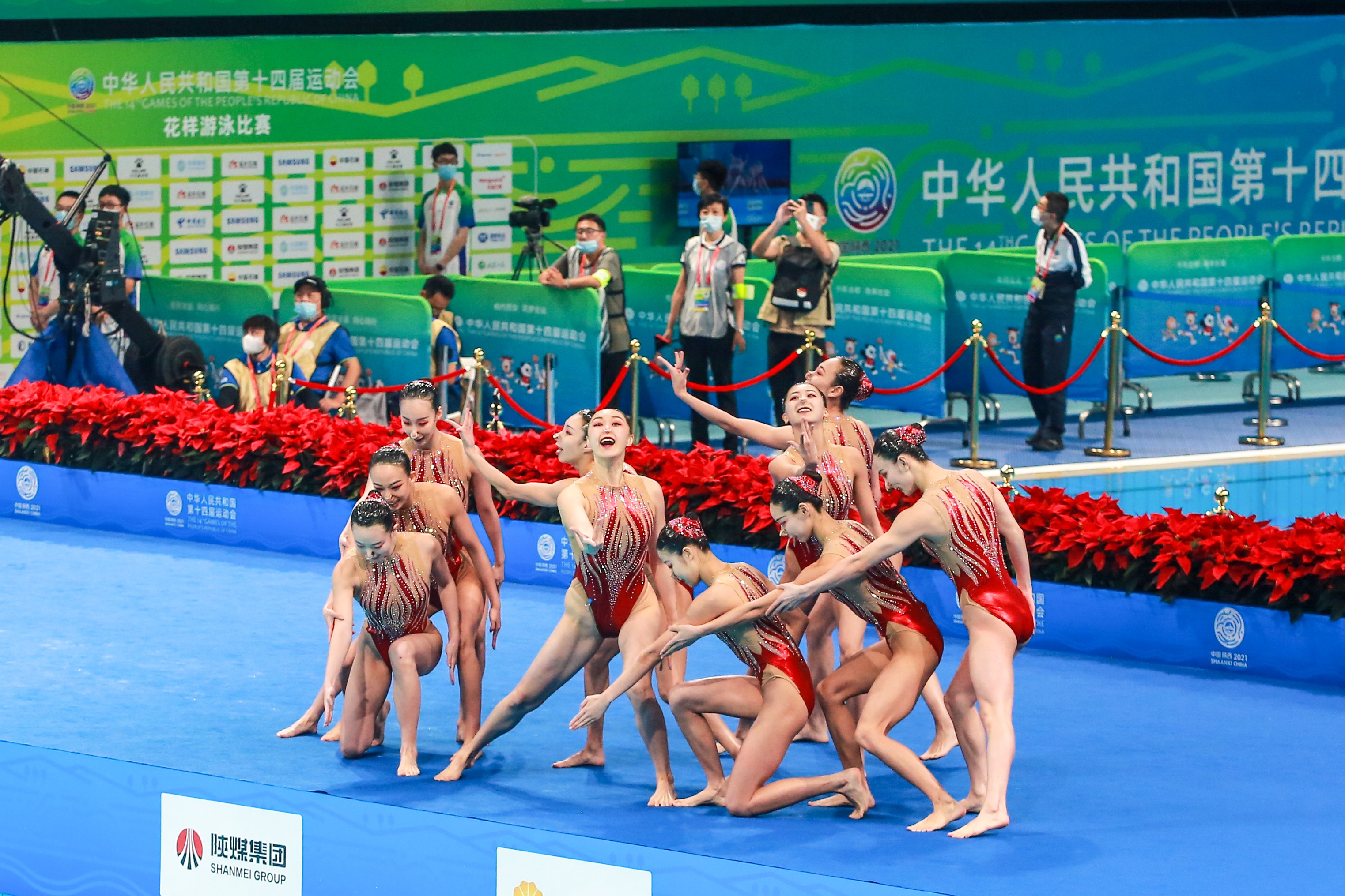 9月1日,第十四届全运会花样游泳自由组合项目比赛拉开帷幕,运动员在有着“长安鼎”美誉的西安奥体中心游泳跳水馆展开角逐。北京代表队的10朵金花常昊、程文涛、胡玥琪、李默、林彦君、尚菲、孙馨、王子睿、于乐乐、张嘉雯登场亮相。历经一番角逐,10朵“金花”在自由组合项目比赛中得到了完成分27.4000分,艺术印象分36.5333分,难度分27.4000分,以总分91.3333分取得了自由组合项目的冠军,为北京代表团摘得首金。