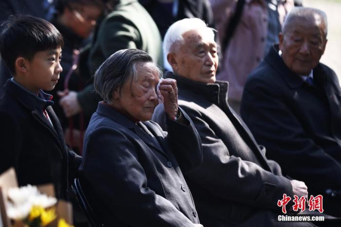 2021年4月4日,“南京大屠杀死难者遗属2021年清明祭仪式”在侵华日军南京大屠杀遇难同胞纪念馆“哭墙”前举行。图为南京大屠杀幸存者夏淑琴(左二)参加清明祭仪式。中新社记者 泱波 摄