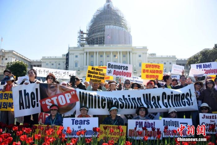 当地时间2015年4月29日,多个韩裔、华裔民间团体和反战组织在美国会大厦外举行抗议示威活动,要求时任日本首相安倍晋三就历史问题做出道歉,承认日本在二战期间的暴行。中新社发 刁海洋 摄