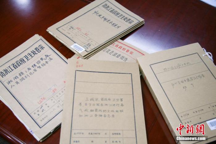 2014年8月15日,浙江省档案馆公布的13份侵华日军在浙江实施细菌战的档案。其中,包括往来文电类档案8件,疫情报告类档案5件。中新社发 李晨韵 摄