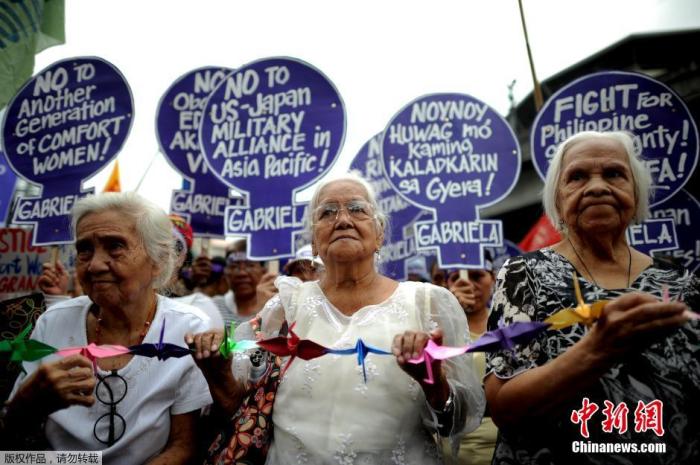 当地时间2016年1月27日,菲律宾马尼拉,菲律宾前二战“慰安妇”受害者及民众聚集在总统府马拉坎南宫前示威抗议,要求日本政府道歉并赔偿。