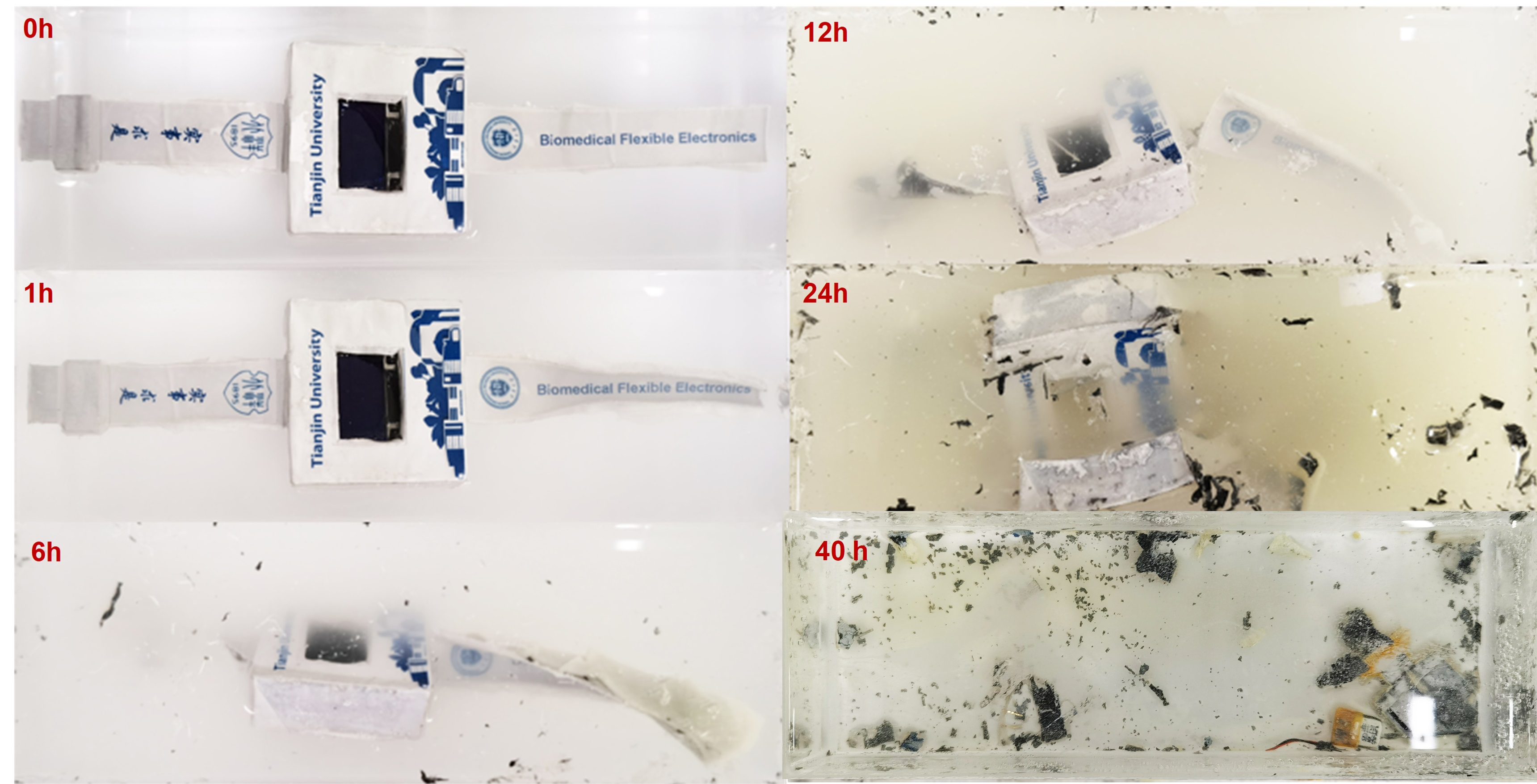 黄显介绍,可溶解智能手表其实是一种瞬态电子器件,当电子功能器件在实现指定功能或完成某项任务后,其物理形态和功能可以在外界刺激触发下,发生部分自毁消失或者完全自毁消失。水就是这款手表的刺激物,在水的刺激下,手表会发生溶解。
