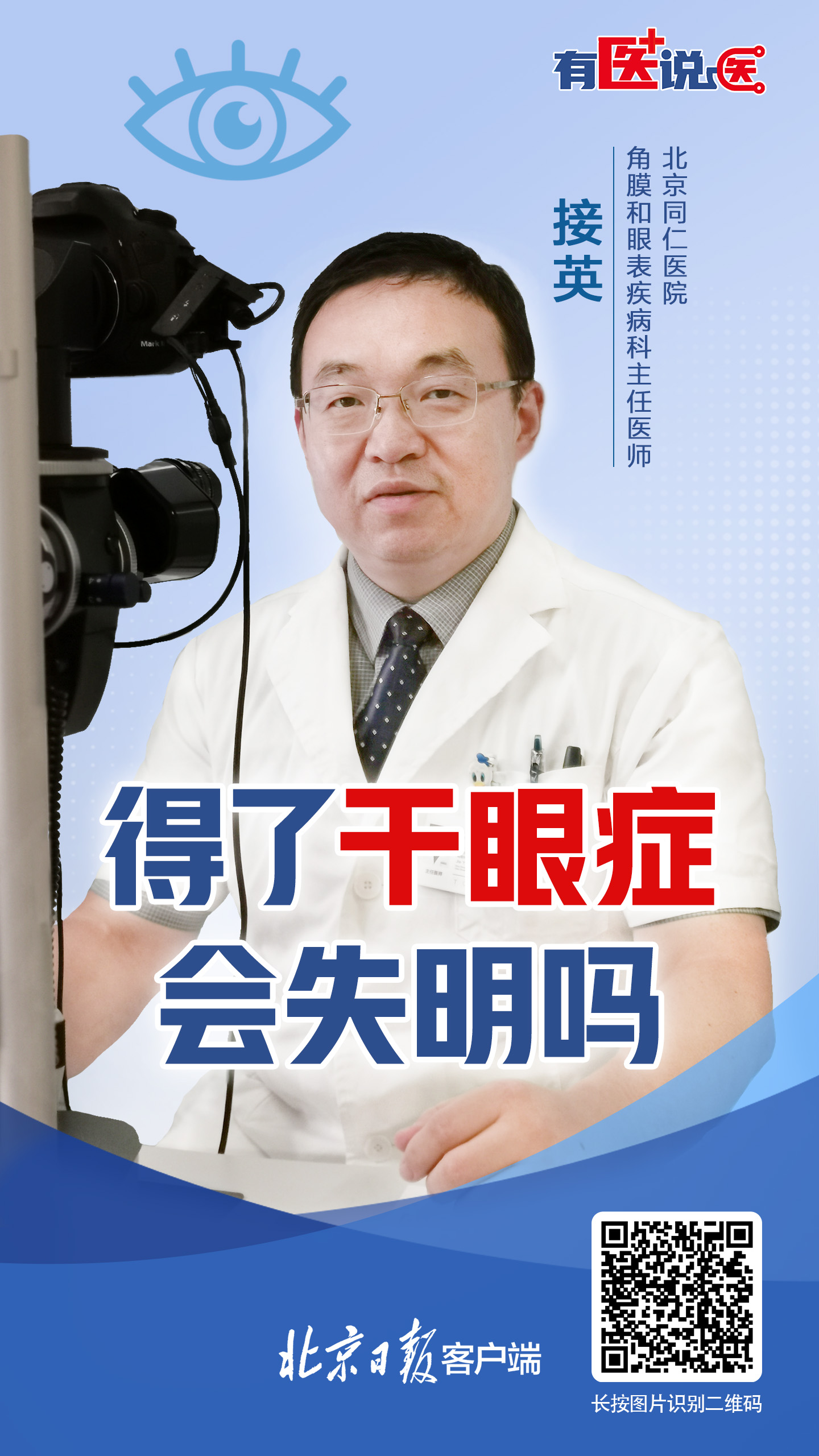 北京同仁医院角膜和眼表疾病科主任医师接英:其实,绝大多数干眼症与失明没有明显的关系,大家不必过度担心。多数干眼症会造成视力的波动,但不会造成明显的视力下降。得了干眼症有哪些明显的症状?又该如何治疗呢?来听听接英怎么说。
