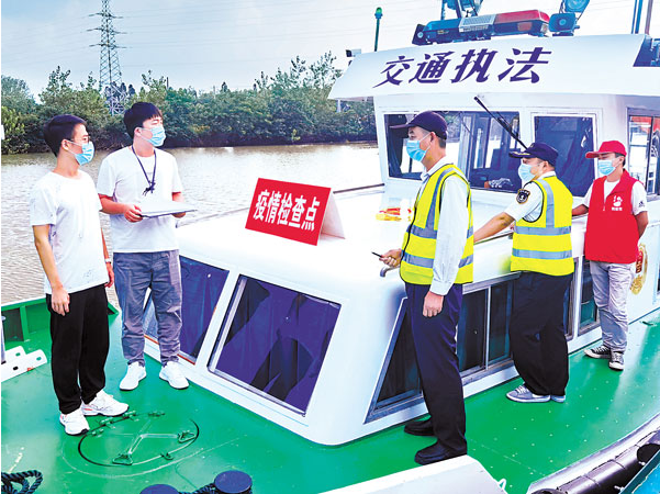 图为江苏省金湖县纪委监委疫情防控督查组干部在石岗码头检查疫情防控措施落实情况。隋晓文 摄