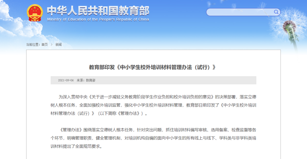 为贯彻落实中共中央办公厅、国务院办公厅《关于进一步减轻义务教育阶段学生作业负担和校外培训负担的意见》,教育部等部门就加强中小学生校外培训材料管理、义务教育阶段学科类校外培训收费监管等事项发文。