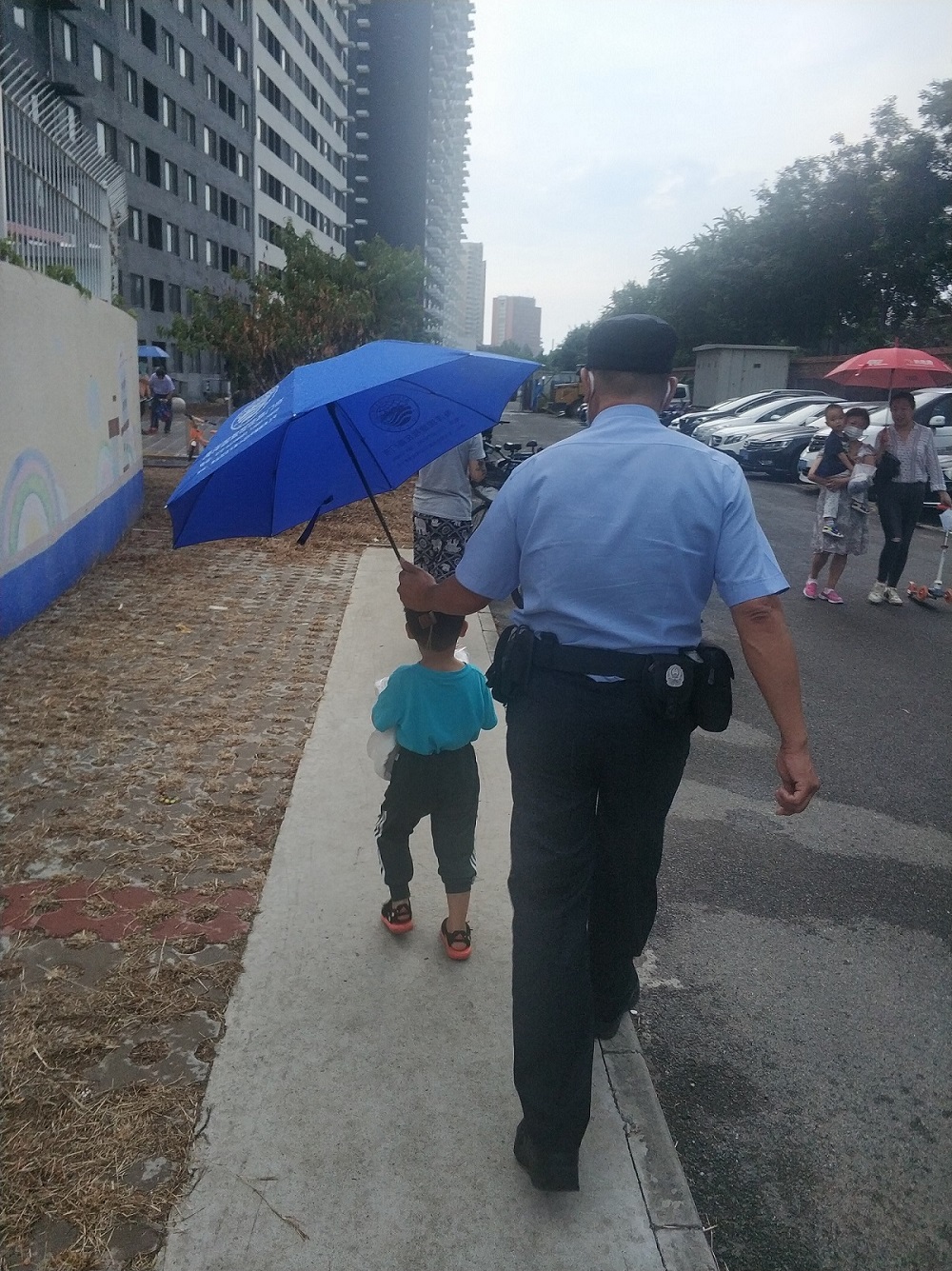 薛警官判断小男孩的家应该离幼儿园不远。“警察叔叔带你去找爸爸妈妈和老师。”他一边不断地安慰孩子让他别害怕,一边引导小男孩返回幼儿园,