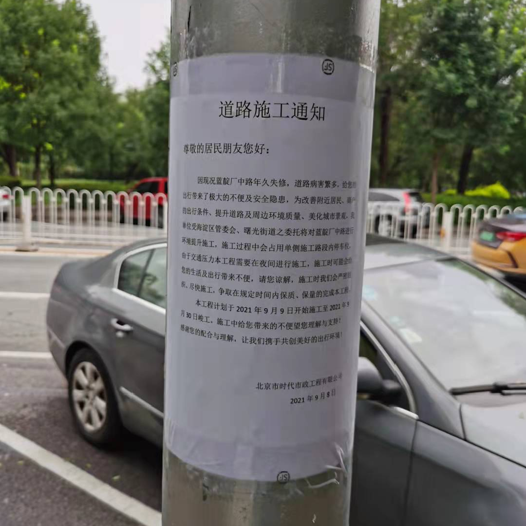 邻居们注意啦!!蓝靛厂中路大修凌晨进场。