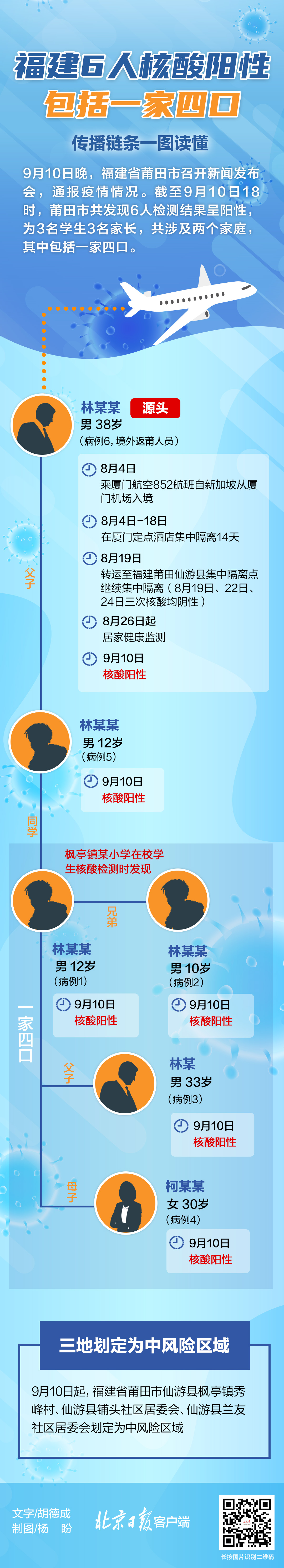 9月10日晚,福建省莆田市召开新闻发布会,通报疫情情况。截至9月10日18时,莆田市共发现6人检测结果呈阳性,为3名学生3名家长,共涉及两个家庭,其中包括一家四口。