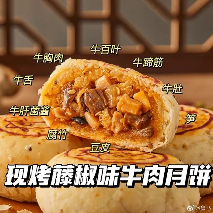 商家推出的,还有冷锅串串月饼——牛胸肉、牛百叶、牛蹄筋、牛舌、牛肚、牛杆菌酱,再加上豆皮、腐竹、笋原料串起来,搭配鲜香麻辣的藤椒锅底,红油拌上芝麻做成馅。有网友发问:这还叫月饼吗?