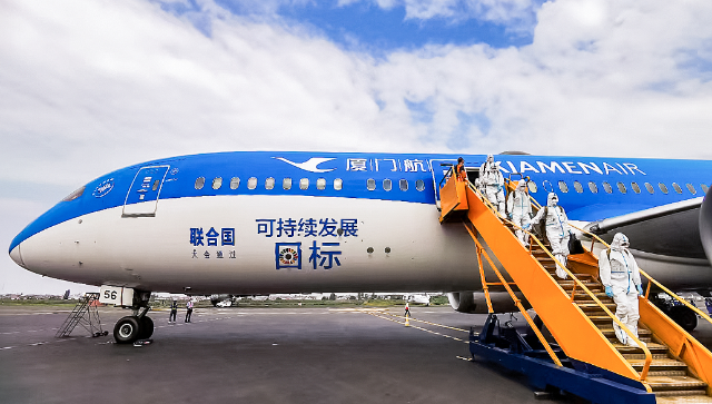 此前的9月12日凌晨2时40分,厦航MF8005航班搭载第25批第一梯队维和官兵从成都双流机场出发,飞往戈马机场,接替中国第24批赴刚果(金)维和部队,执行为期一年的维和任务。厦航选用曾成功执行马里维和部队任务的“联合梦想号”飞机进行执飞,这是全球唯一经过官方认证的联合国特殊涂装飞机。
