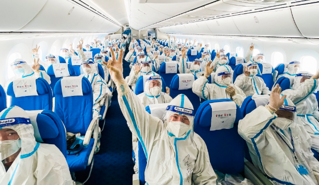 9月13日上午6时50分许,厦航MF8006(戈马-兰州)航班落地兰州中川机场。航班搭载的近百名中国维和人员在非洲刚果(金)执行完成为期一年的维和任务后,返回祖国怀抱。