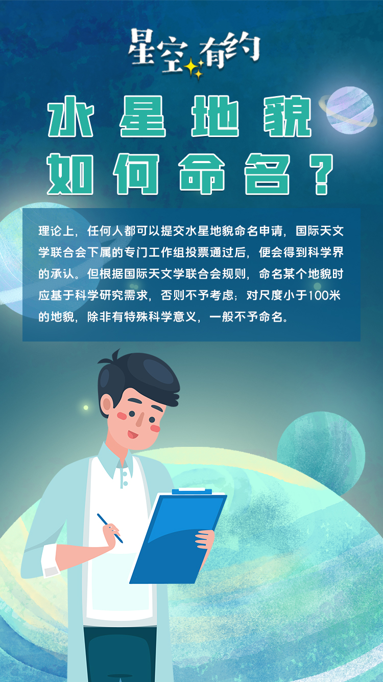 “理论上,任何人都可以提交水星地貌命名申请。提交名称需遵循简洁明晰、无害性、不重复原则,并且考虑文化多样性和国家均衡。”王科超说,根据国际天文学联合会规则,命名某个地貌时应基于科学研究需求,否则不予考虑;对尺度小于100米的地貌,除非有特殊科学意义,一般不予命名。