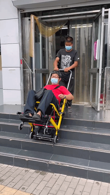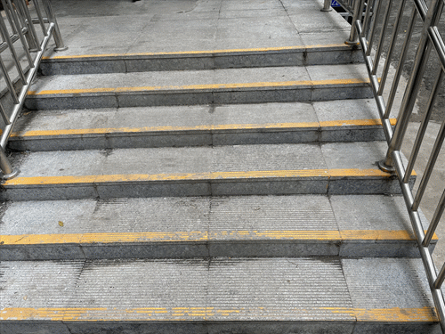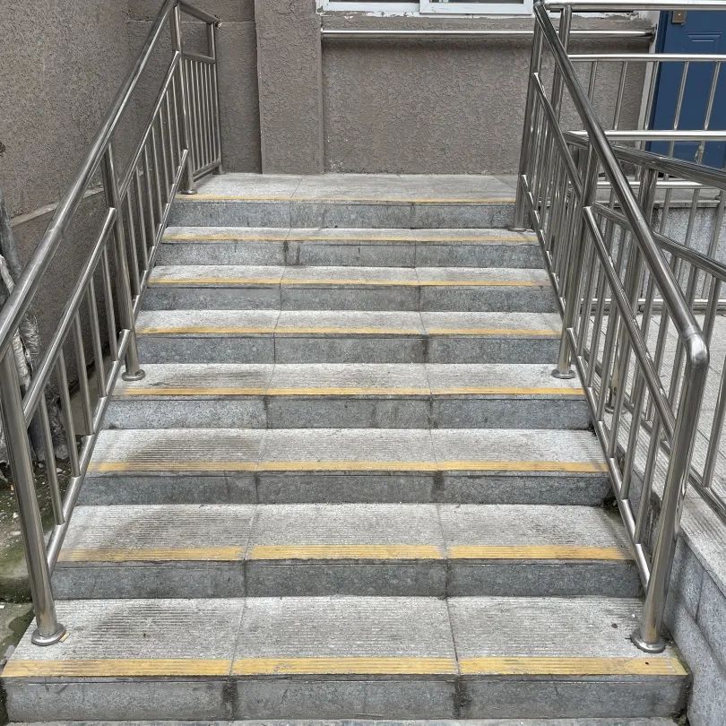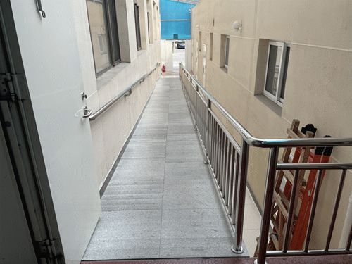 这条双向无障碍坡道自从去年上岗以来,大大方便了老年人的出行,而一侧楼梯上的黄色标识线清晰醒目,极大增强了老年人出行的安全性。