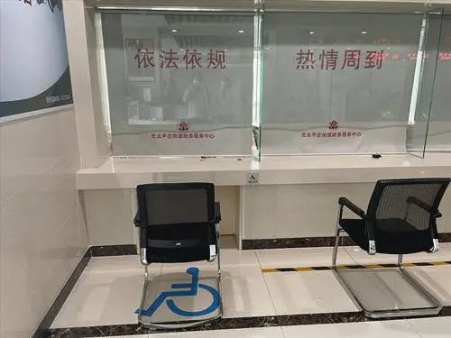 在北太平庄街道政务服务中心,一进门小编就看到有一个专门为残疾人办理业务所设计的低位服务台,贴心的存膝设计,让残疾人在办理业务的时候更加便利舒适。