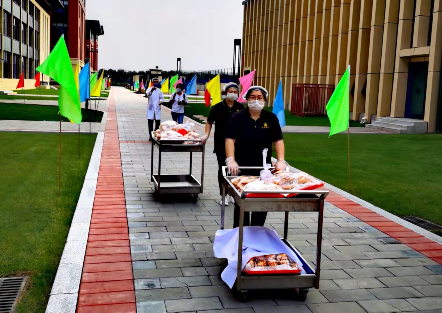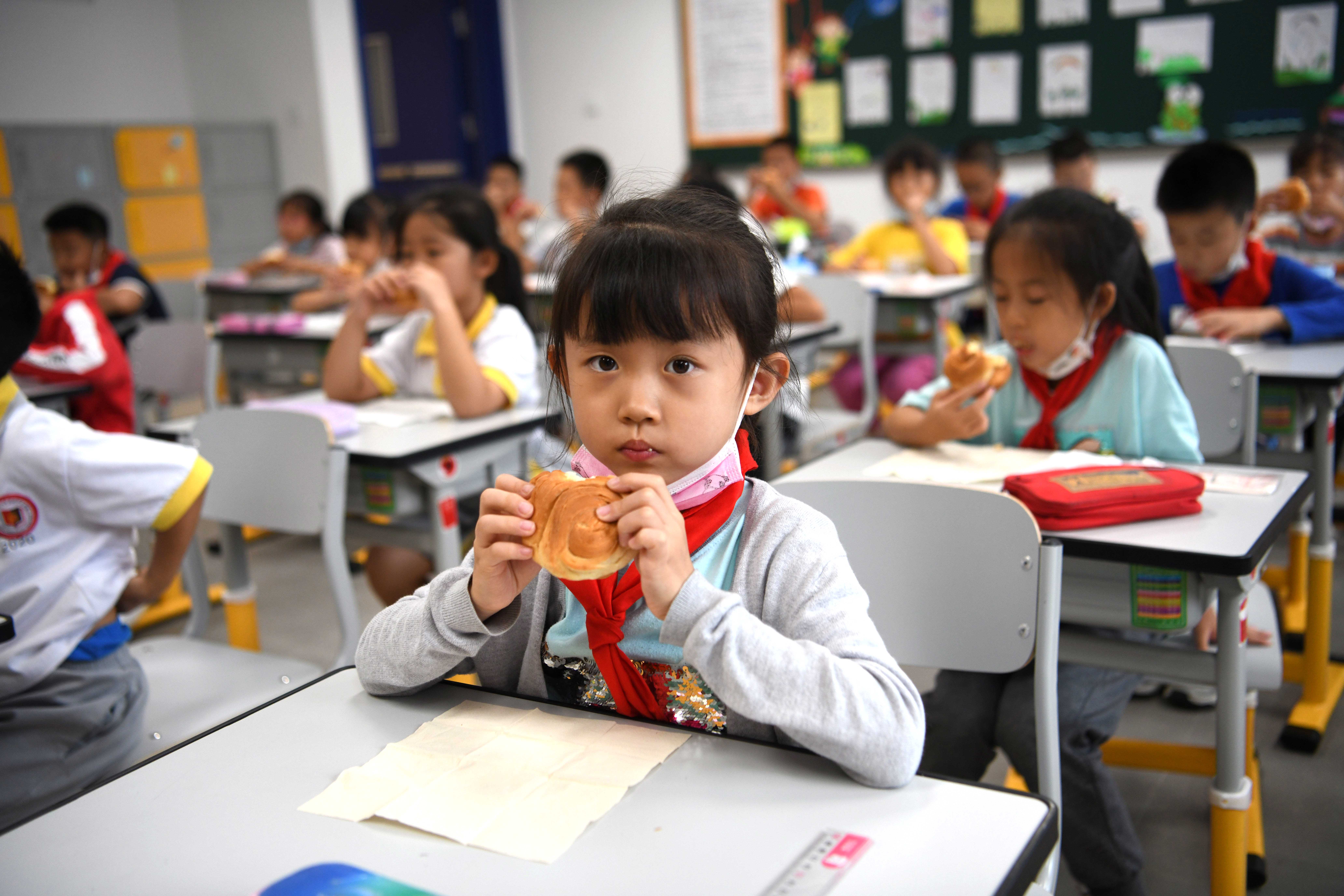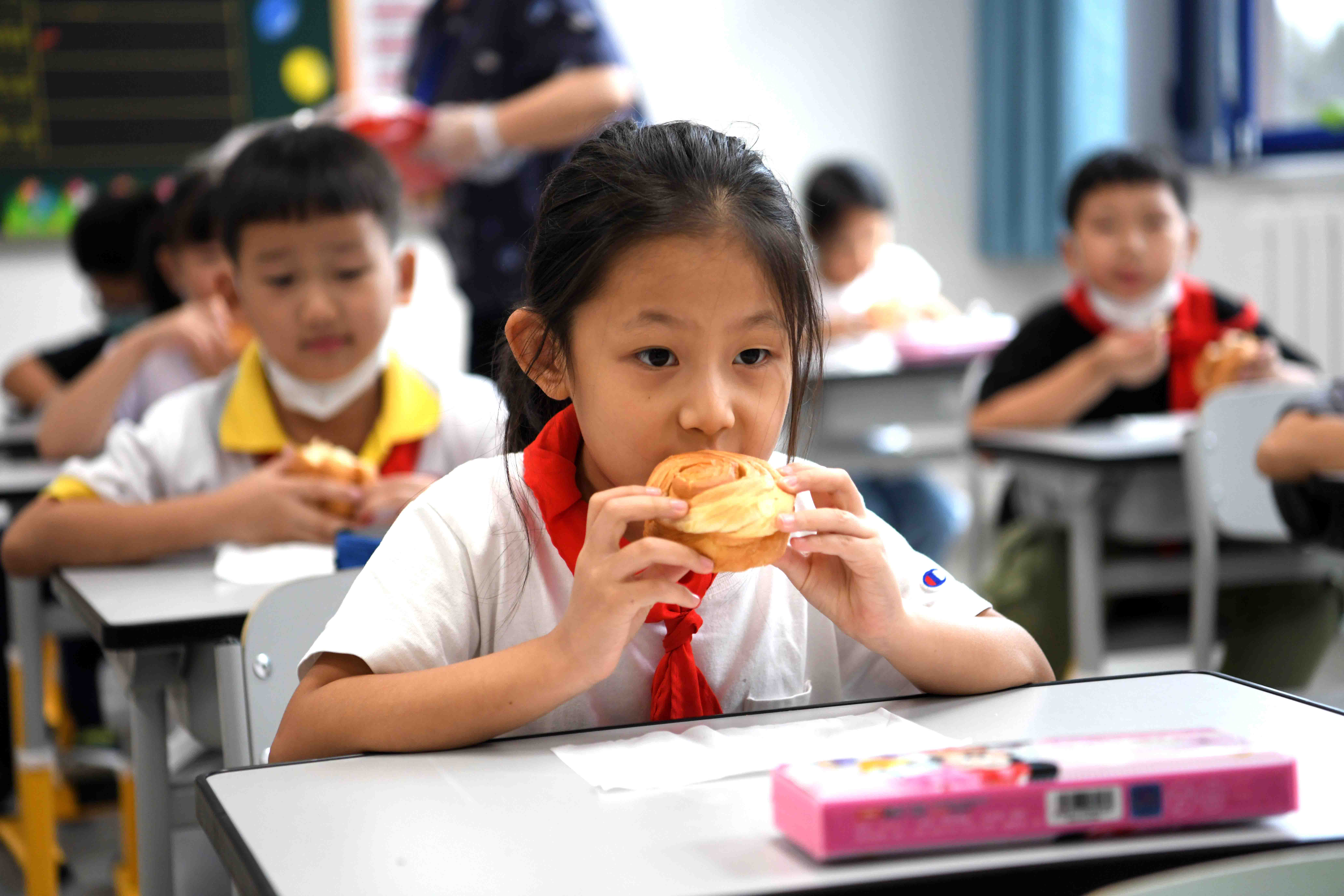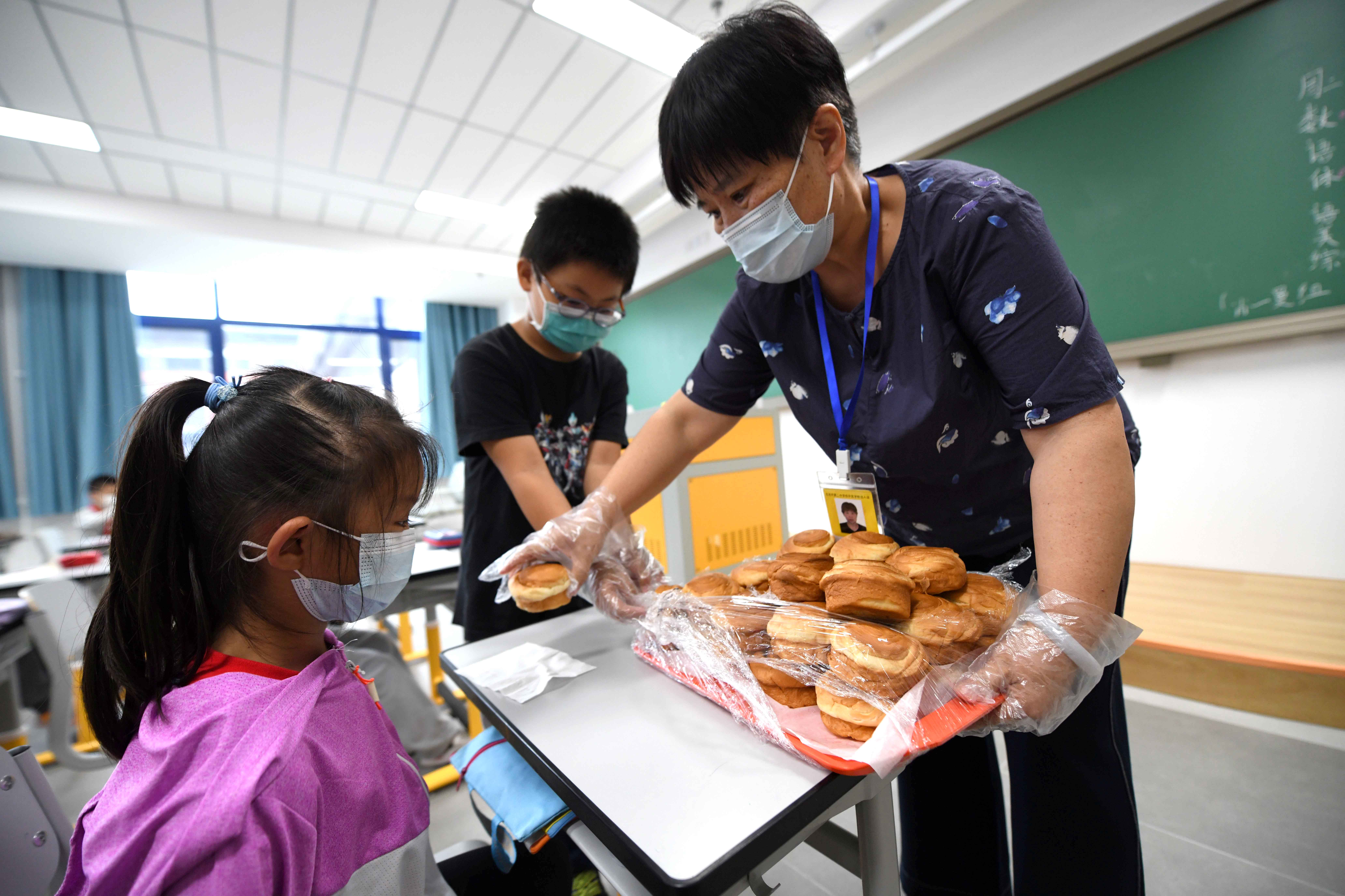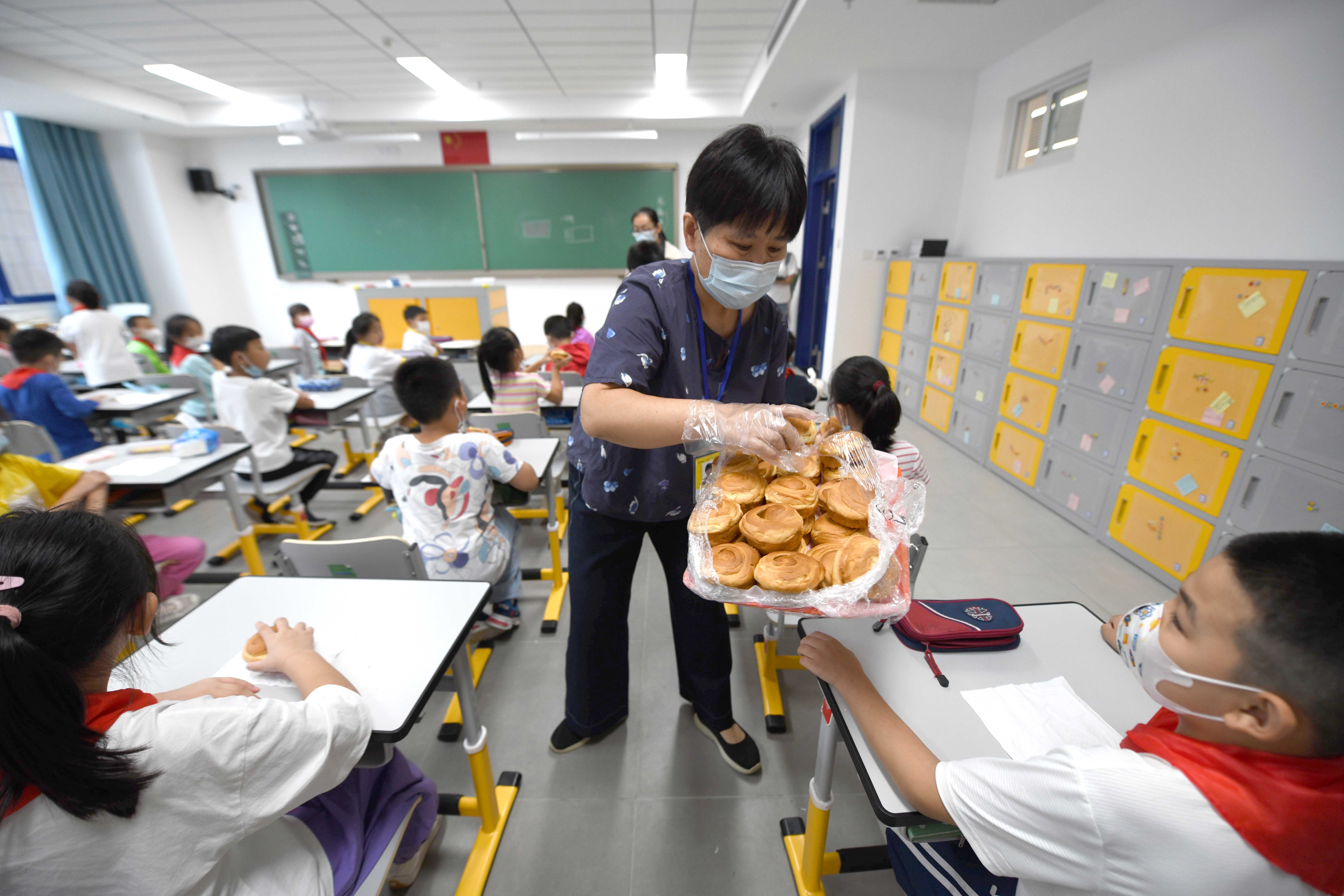 二年级1班班主任苑玉梅早早等候在教室门口,没等乐曲响完,她便推门走了进去。“老师,我肚子都饿了。”“老师,我们今天吃什么呀。”看到苑玉梅,孩子们亲热地跟老师聊了起来。苑玉梅戴上一次性手套,指了指手上的软面包,“孩子们,先去洗手,今天我们吃面包。”“耶!”学生们默契地排队出门;洗完手后,回到座位,掏出纸巾铺在桌面,从老师手里接过面包便静静吃了起来。