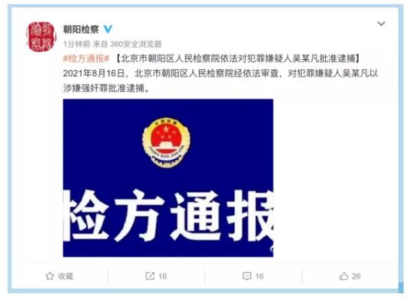 对曾是一线明星的吴某凡批准逮捕