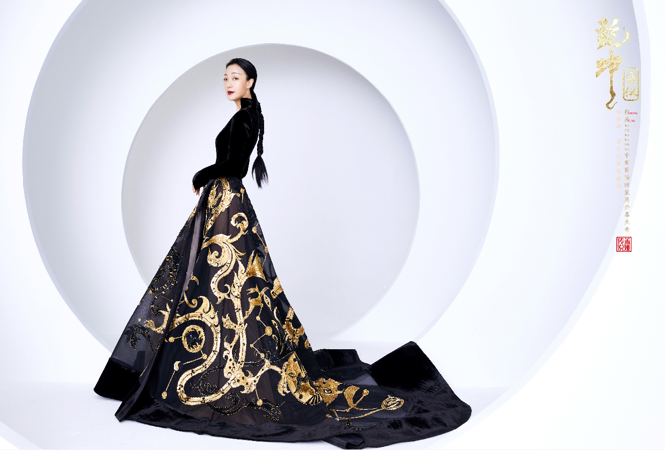 首套服装以具有敦煌特色的色彩搭配为基调,袖口、袖子以及后背均采用了非遗的工艺打籽绣。以精细的点状打籽绣呈现中国传统纹样海水江崖纹。海水江崖纹上,经典的文官图腾一品仙鹤与之相映成趣。在文雅的基调上,服饰下摆创造性地锥以灵动的流苏,腰间增加了轻盈的纱质,有效地中和了文官图腾的严肃肃穆和当代服饰的灵动时尚。此外,袖口的珠子采用纯手工金线缠绕,细节之处体现品牌匠心。