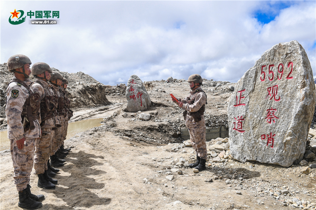 5592观察哨官兵学习完回信后,面对党旗郑重承诺,为祖国站好岗、守好边。陶云波 摄