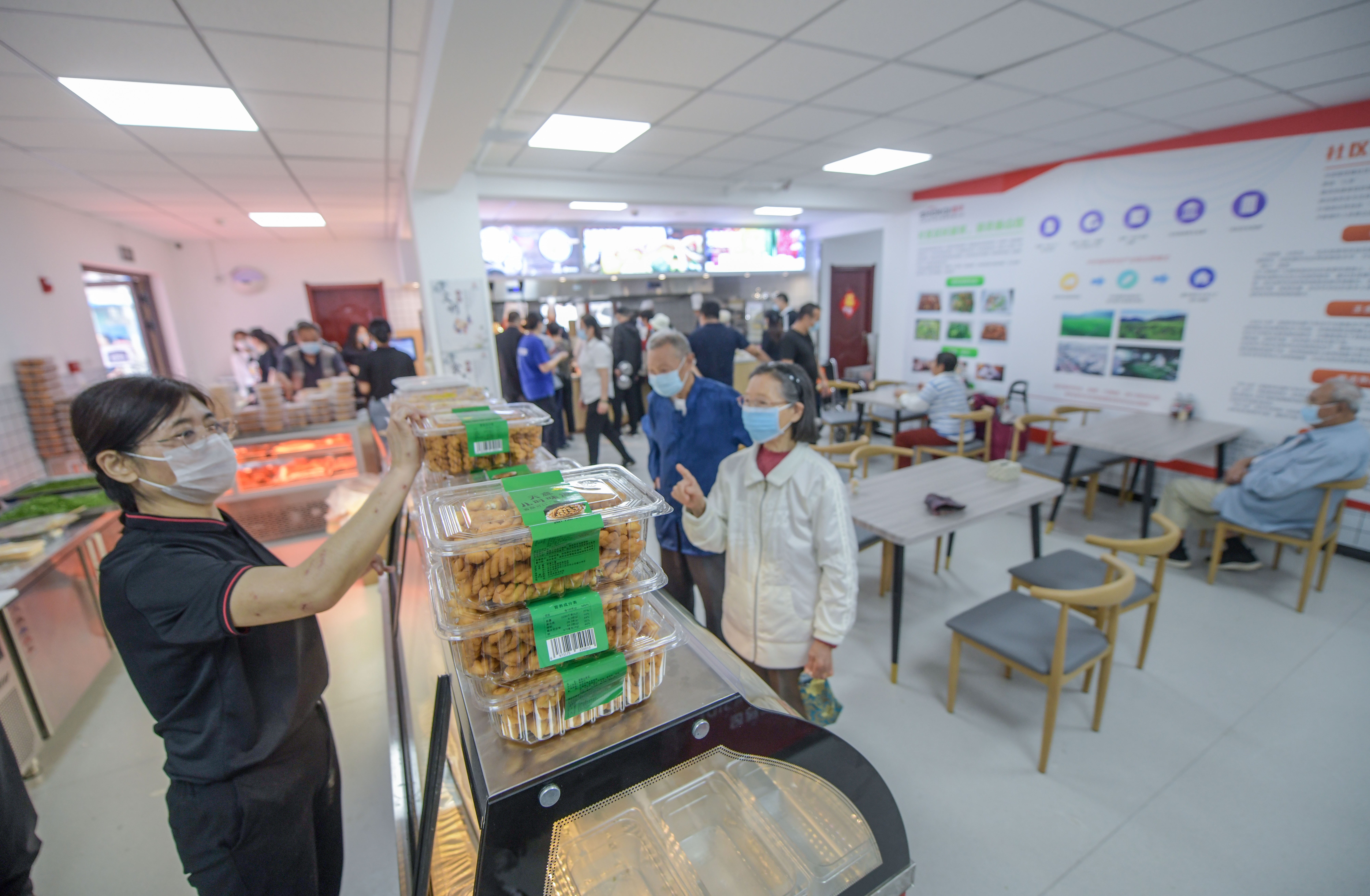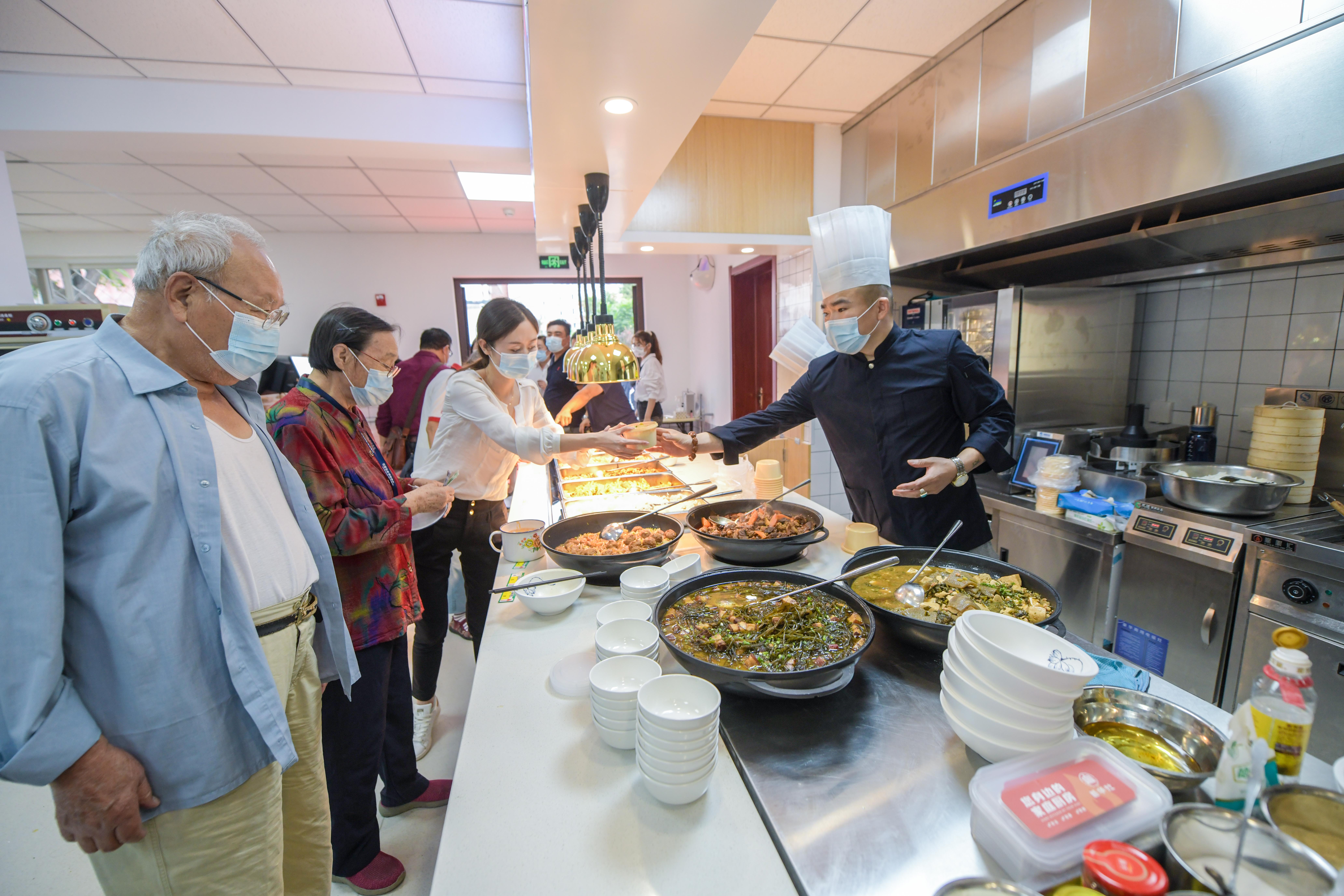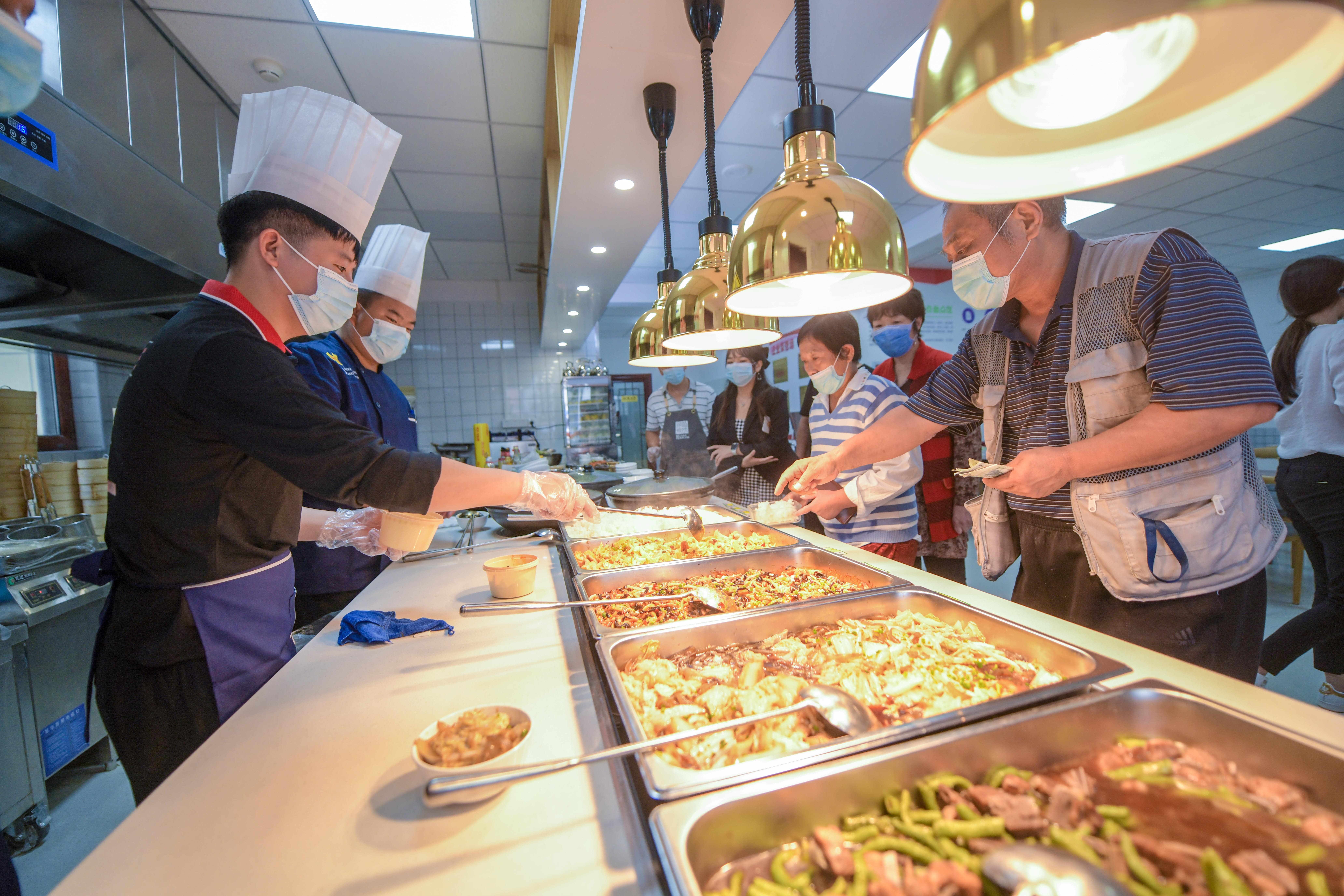 “早就盼着它开了。”居民张阿姨是第一批到达的。她从食堂打包了一份雪里红炖豆腐、一份牛肉炖萝卜、两盒米饭,在收银台一结账,总共31元,“一顿饭,人均15元,比在外面餐馆吃便宜不说,关键是方便。”