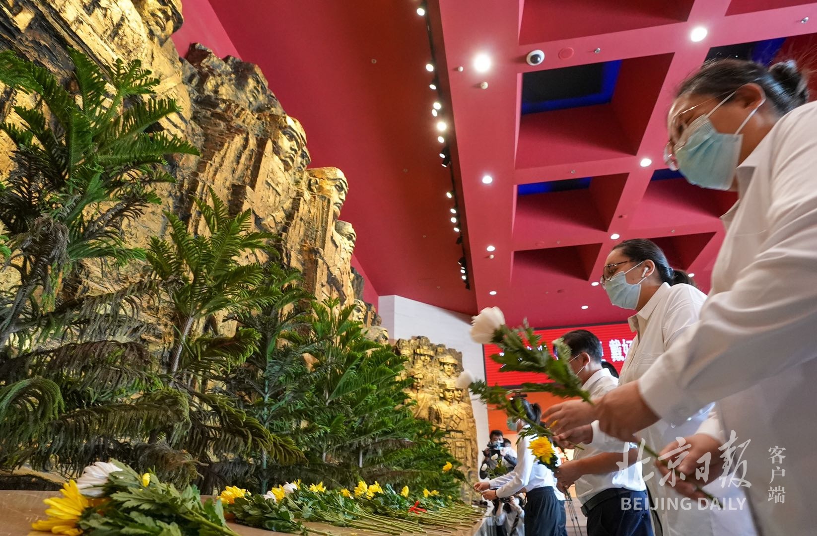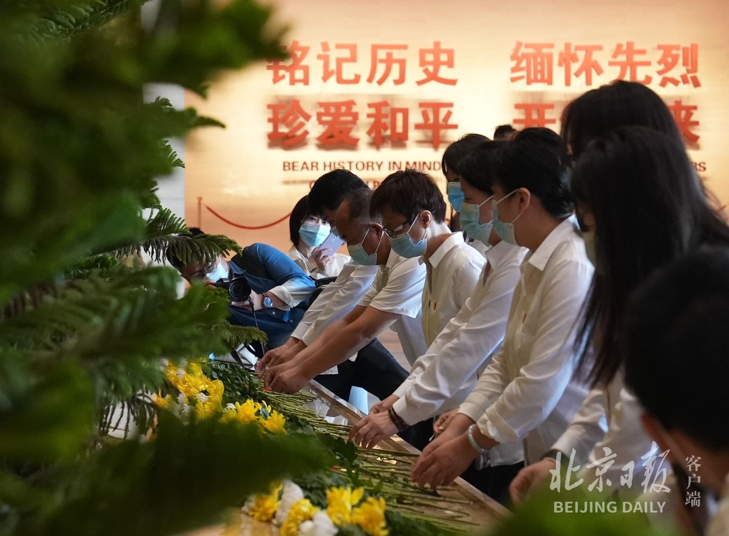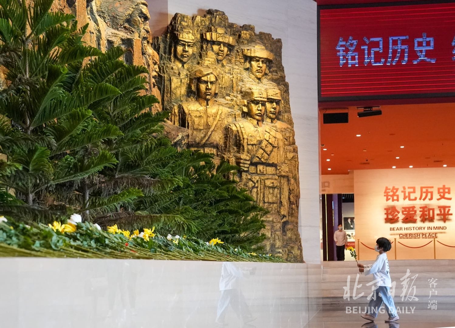 9月18日,中国人民抗日战争纪念馆序厅的铜墙铁壁雕塑前,菊花一列排开,淡雅别致。今年是九一八事变爆发90周年,抗战馆举行“铭记九·一八”主题活动,大家以鲜花献上哀思与纪念。
