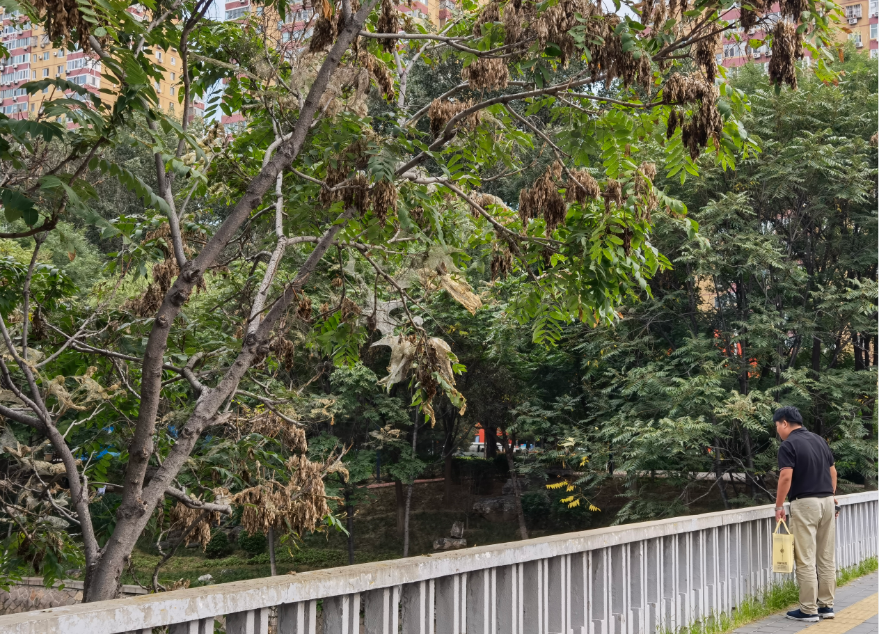 “北小河沿岸,尤其是望京花园小区这一段,树上都是密密麻麻的虫子,海棠、杨树、梧桐、柳树、樱花……有的树已经整株被吃光,往年从未见过!以前忍冬的叶子很晚才会落下,现在已经开始枯萎了,我窗外的樱花树这两天也是,好几条枝都枯死了。仔细一看,枝叶上缠满了虫丝,树下的地面可以看到很多虫子,小孩子都害怕。”王女士担忧地说,她最早关注到树木遭遇虫害是在上个月,到现在情况愈加严重。