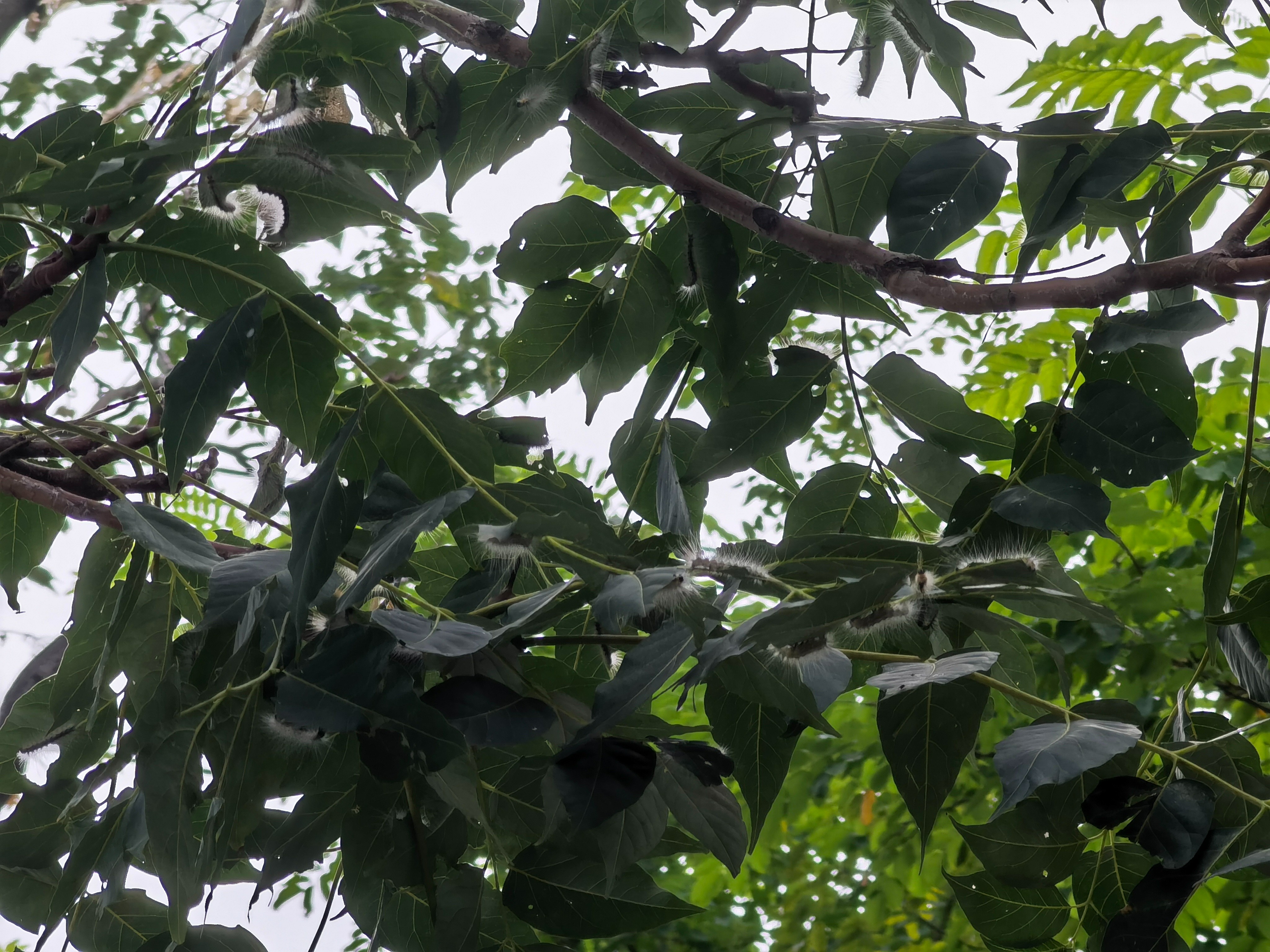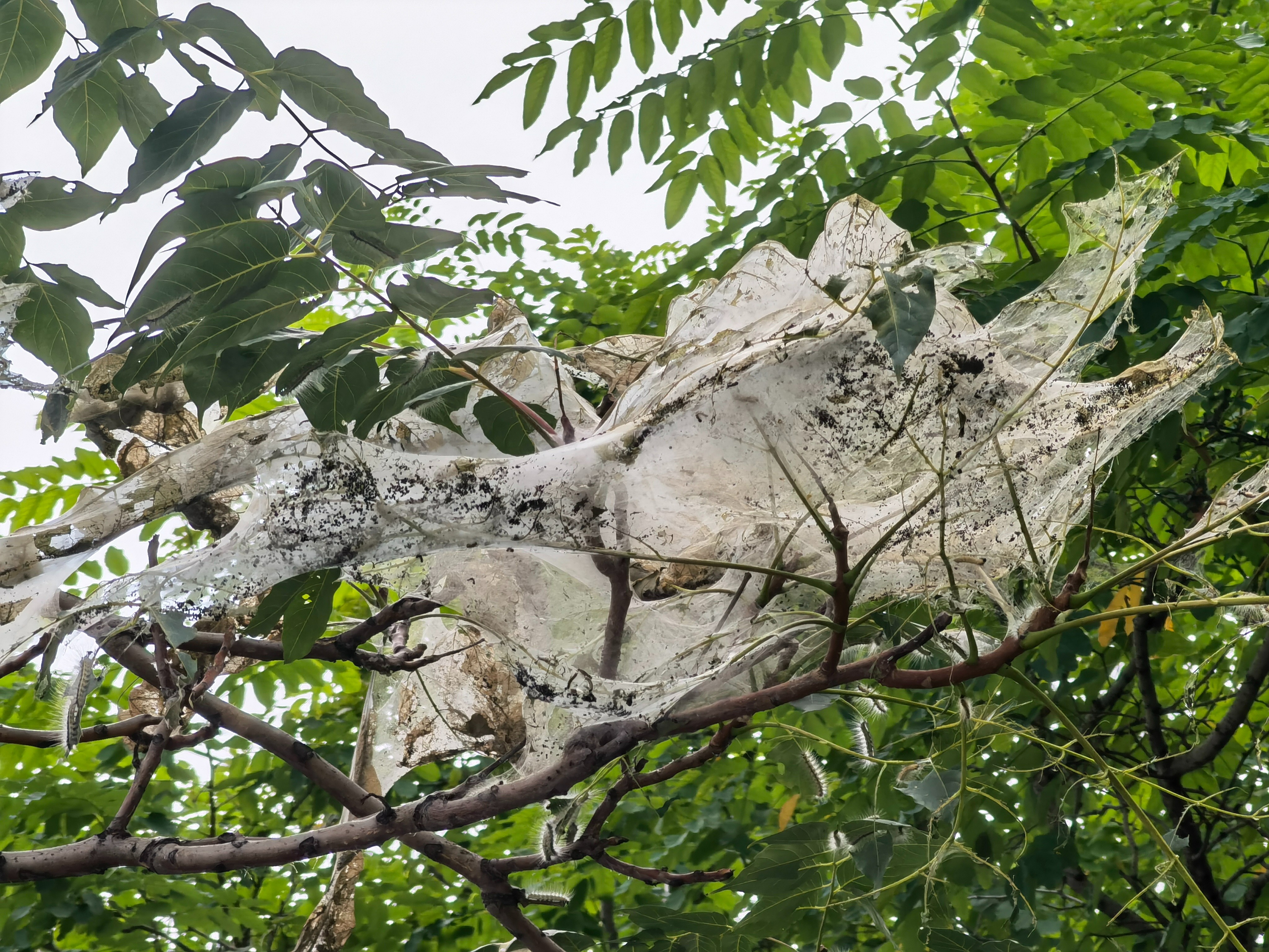 沿东湖步道行进,一路上有10余棵树木都存在类似情况。在一棵椿树上,几乎每个树杈上都有虫丝,虫丝上布满密集的小黑点,树顶已经被啃成了光秃秃的一片,大部分叶子已被虫子啃食,只剩下叶脉。