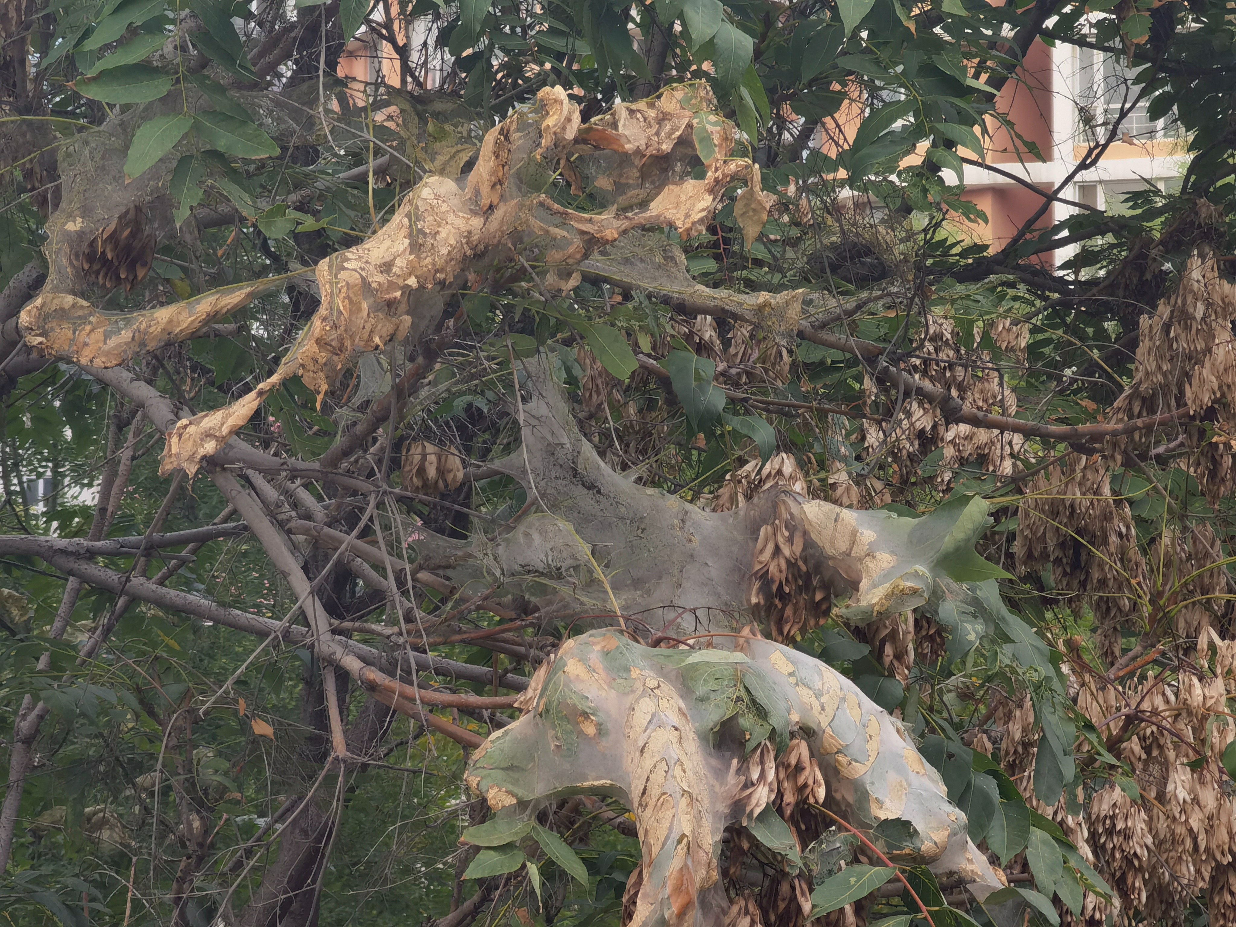 记者在广顺北大街与溪阳中路交叉口看到,与周边绿油油的健康树木相比,一棵高大的行道树上半边树叶几乎掉光,仅剩的多数枝叶也发黄干枯,枝杈上缠着结网的虫丝,远远看去,厚密的虫网仿佛一层覆盖在树梢上的积雪。而在一棵约3层楼高的杨树上,可以看到正在爬动的白色毛毛虫。“太瘆人了,最近都不敢在树下走,前两天我看到地面上爬着30多只小黑虫和大毛毛虫,有的还往我身上掉。”一位居民说。