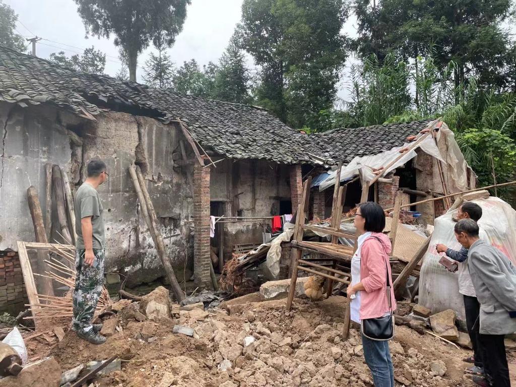 9月18日,在福集镇万宝村,村党总支副书记谭光菊(右三)率领党员干部查看农房受损情况。(受访者供图)