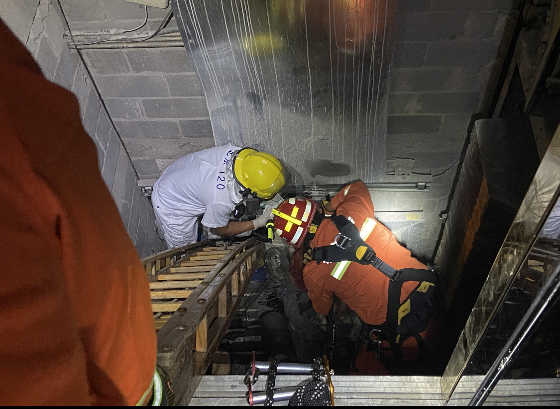 仅10分钟,救援站消防指战员火速到达现场。随后,消防指战员了解到,该事故系两名电梯维修人员在5层维修电梯工作时电梯突发故障,两名维修人员随电梯一同坠入负一层,两人均有不同程度受伤,其中一名维修人员出现严重出血、另一名维修人员出现疑似骨折情况,情况十分危急。