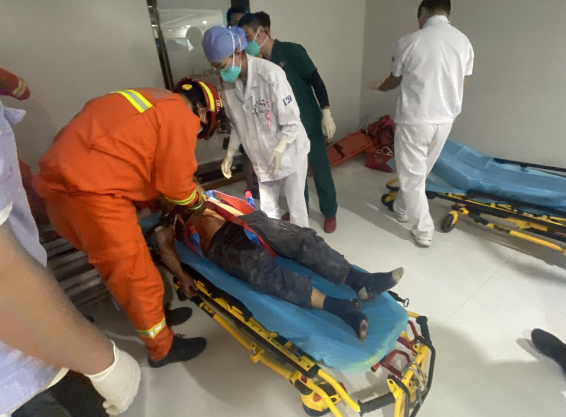 “我的脚断了!”一名消防员刚下到被困者位置,其中一名受伤工人就痛苦地告诉消防员自己的伤情,另一名工人浑身是血,表情痛苦。